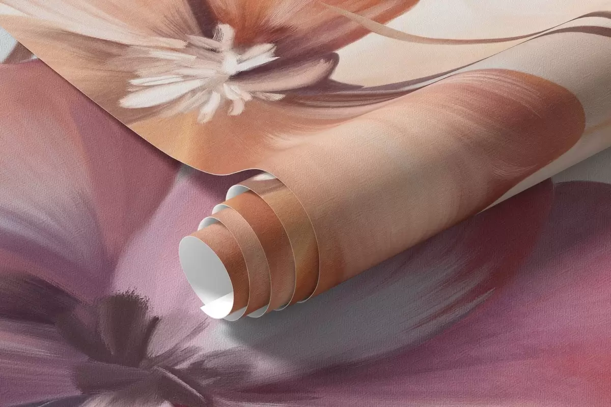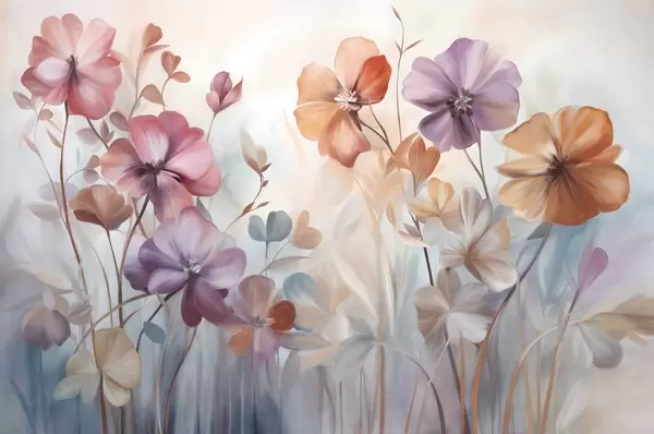 Fotobehang Textuurrijk bloemstuk met roze, paarse en oranje bloemen met groene stelen en bladeren, zachte pastelkleuren N° w09486