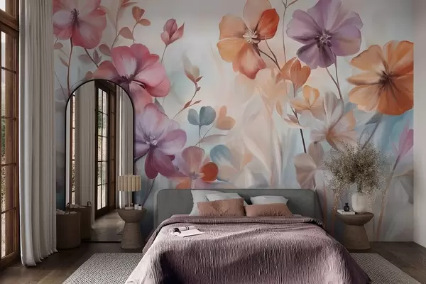 Fotobehang Textuurrijk bloemstuk met roze, paarse en oranje bloemen met groene stelen en bladeren, zachte pastelkleuren N° w09486