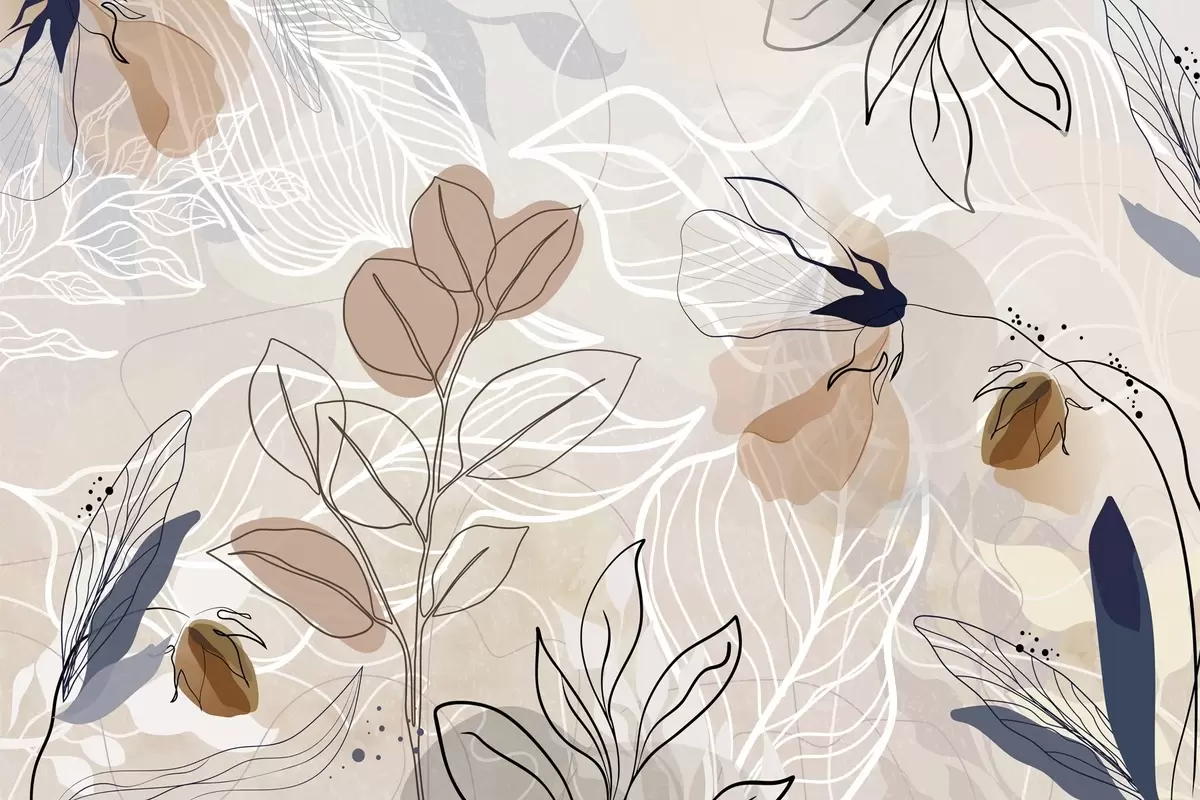 Fotobehang Beige abstracte achtergrond met bladeren en bloemen lijntekeningen, modern, minimalistisch, organische vormen, botanische print N° w09487