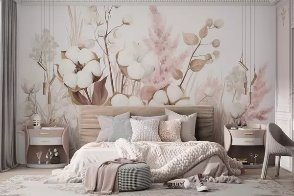Fotobehang Katoenen bloemen met witte en roze pampagras, beige en bruine bladeren en kruiden, witte achtergrond N° w09489
