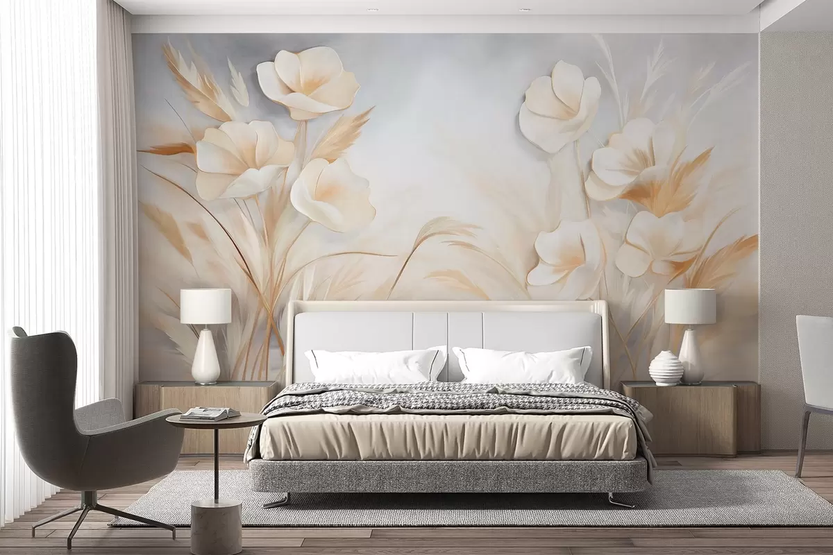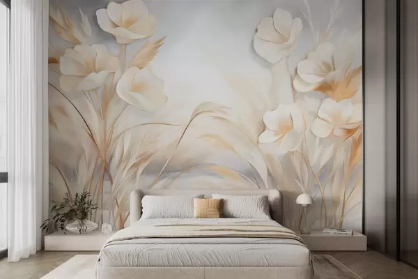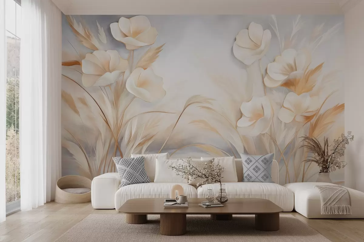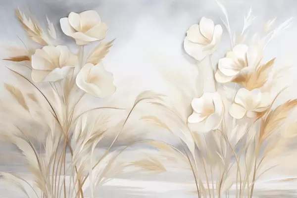 Fotobehang Witte bloemen, beige riet en pampagras, gestructureerd, elegant, minimalistische stijl, abstracte landschapsachtergrond N° w09490