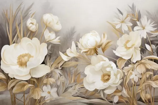 Fotobehang Witte en gele pioenrozen en andere bloemen met hoog gras en bladeren in een zachte, schilderachtige stijl met veel textuur. N° w09494