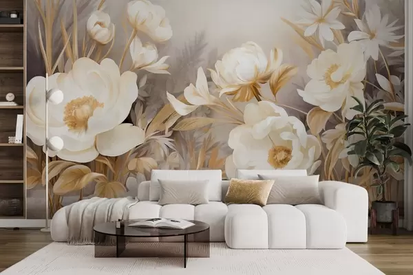 Fotobehang Witte en gele pioenrozen en andere bloemen met hoog gras en bladeren in een zachte, schilderachtige stijl met veel textuur. N° w09494