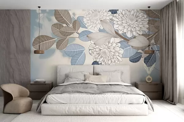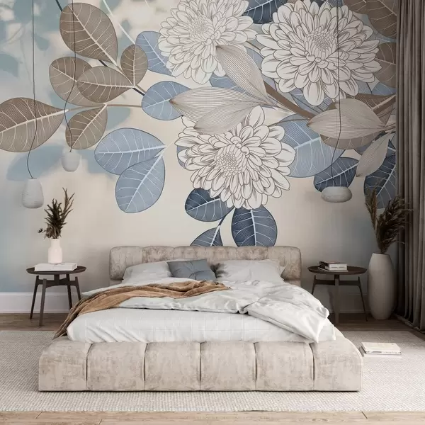 Fotobehang Witte bloemen met blauwe en bruine bladeren, lichtblauwe gestructureerde achtergrond, bloemstuk, gedetailleerde lijntekening N° w09496
