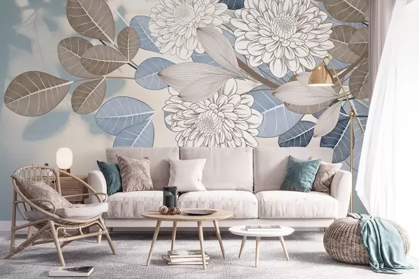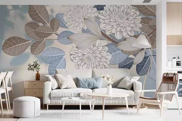 Fotobehang Witte bloemen met blauwe en bruine bladeren, lichtblauwe gestructureerde achtergrond, bloemstuk, gedetailleerde lijntekening w09496