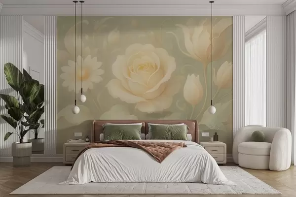 Fotobehang Delicate vintage compositie met beige rozen op een lichtgroene achtergrond N° w09499
