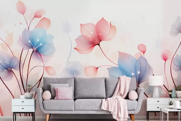 Fotobehang Delicate roze-blauwe bloemen — luchtige flora op een witte aquarelachtergrond N° w09507