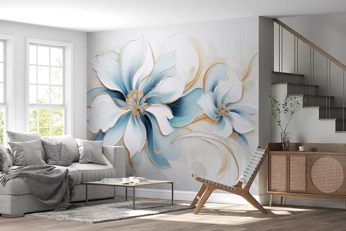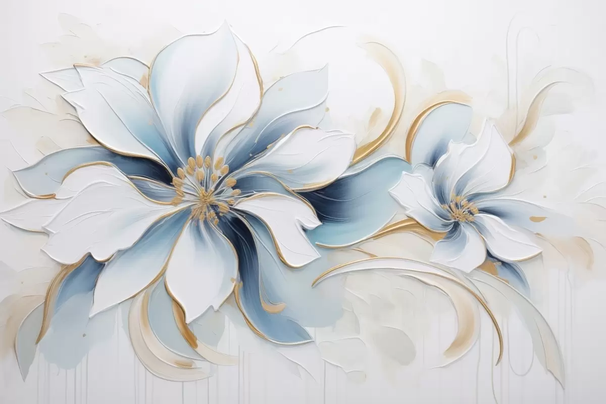 Fotobehang Schilderachtige abstractie met blauwe bloemen in olieverfstijl N° w09524