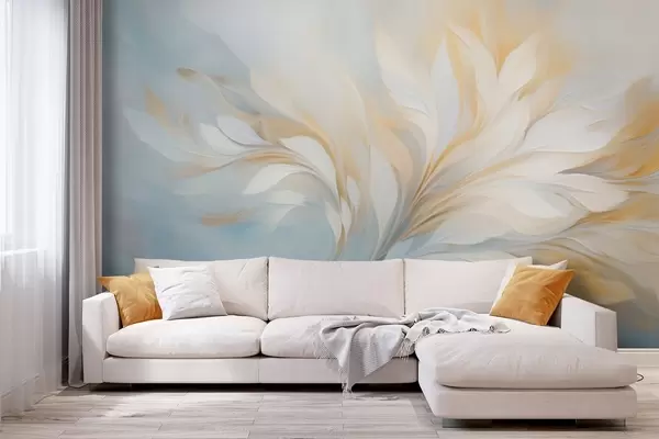 Fotobehang Abstracte compositie van vloeiende, veerachtige vormen in gele en blauwe tinten N° w09525