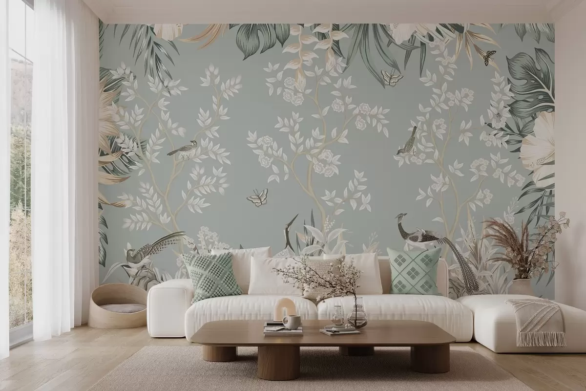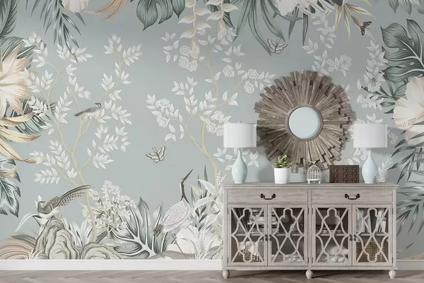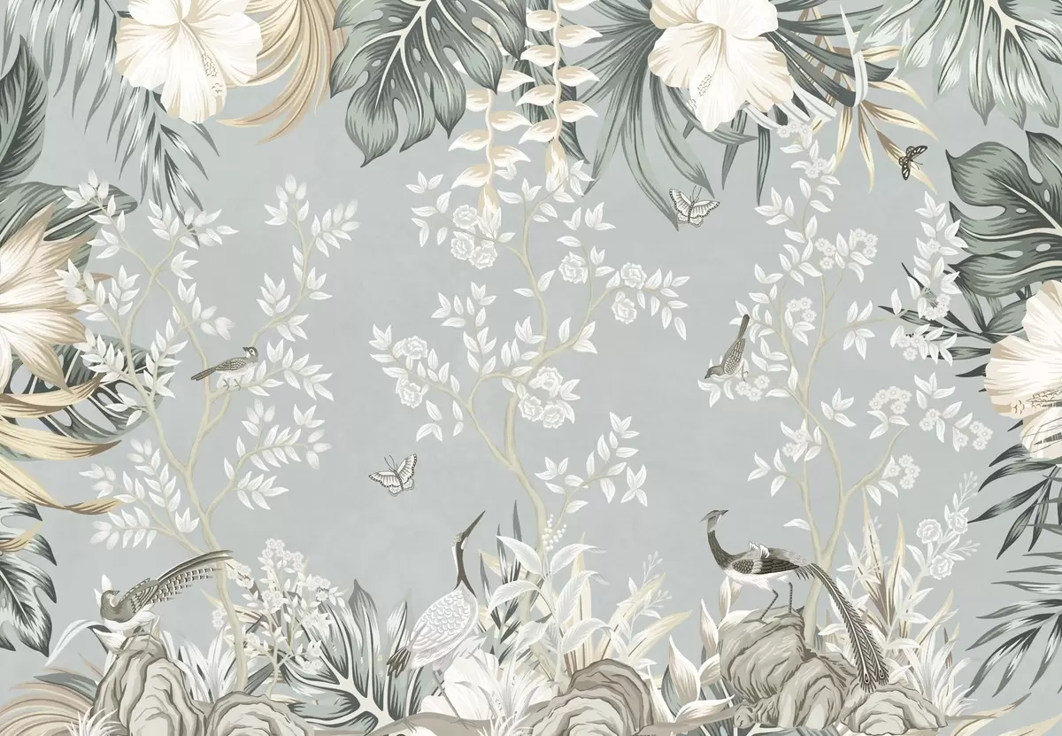 Fotobehang Tropische pastelkunst met textuur, met vogels, vlinders, hibiscusbloemen, palmbladeren en bomen op een lichtblauwe achtergrond. N° w09528