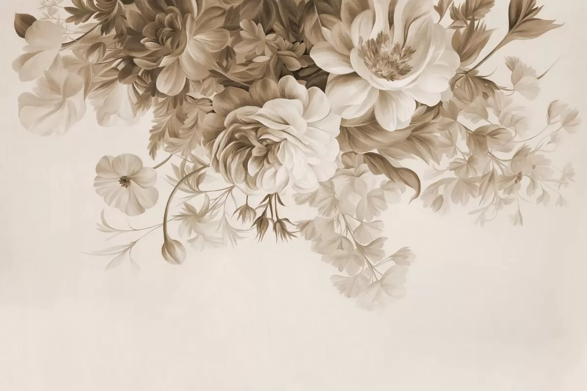 Fotobehang Vintage bloemstuk met rozen, pioenrozen en andere bloemen met textuur en bladeren, op een lichte achtergrond N° w09532v1
