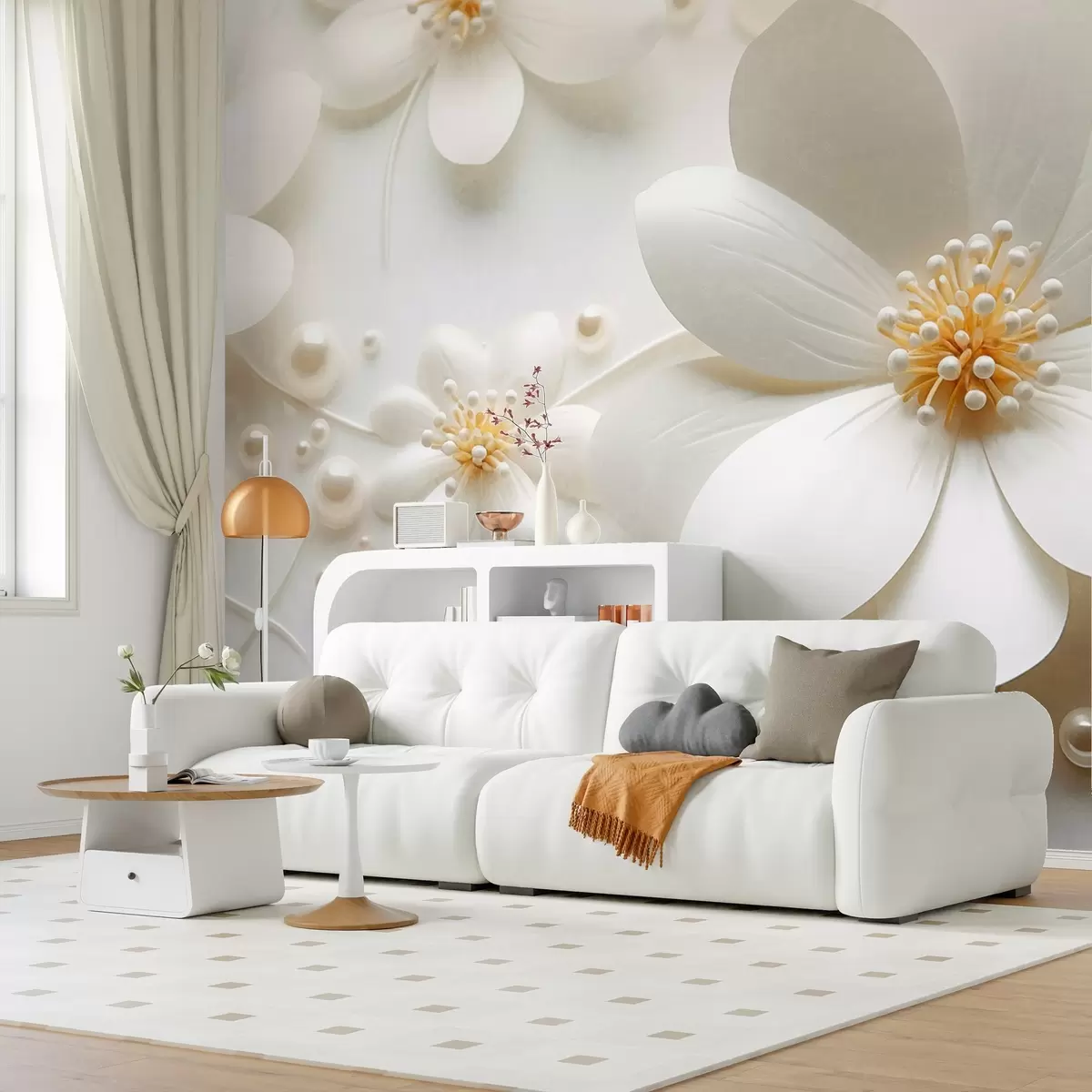 Fotobehang Witte bloemen met parels verspreid over een witte achtergrond, elegant en minimalistisch ontwerp, met textuur N° w09535