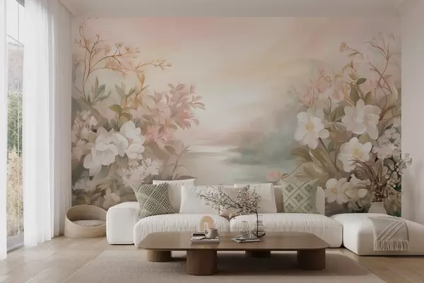 Fotobehang Een landschap met een rivier omringd door bloemen en planten, zachte kleuren, roze lucht, aquarelachtige textuurstijl N° w09537