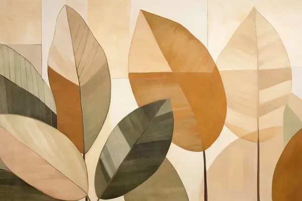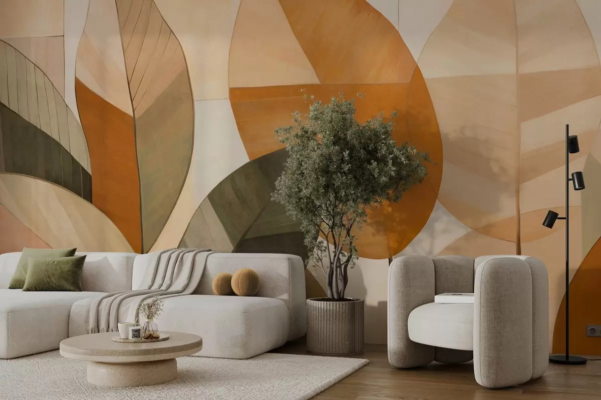 Fotobehang Abstracte grote bladeren in tinten oranje, bruin en groen, gestructureerd, gerangschikt tegen een lichte achtergrond N° w09539