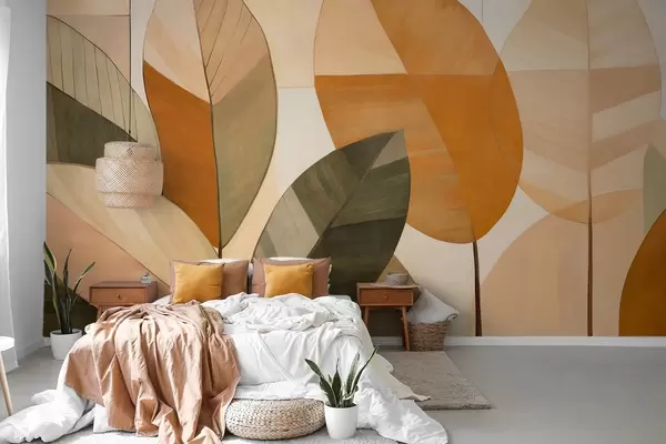 Fotobehang Abstracte grote bladeren in tinten oranje, bruin en groen, gestructureerd, gerangschikt tegen een lichte achtergrond N° w09539