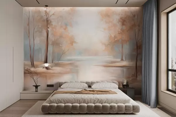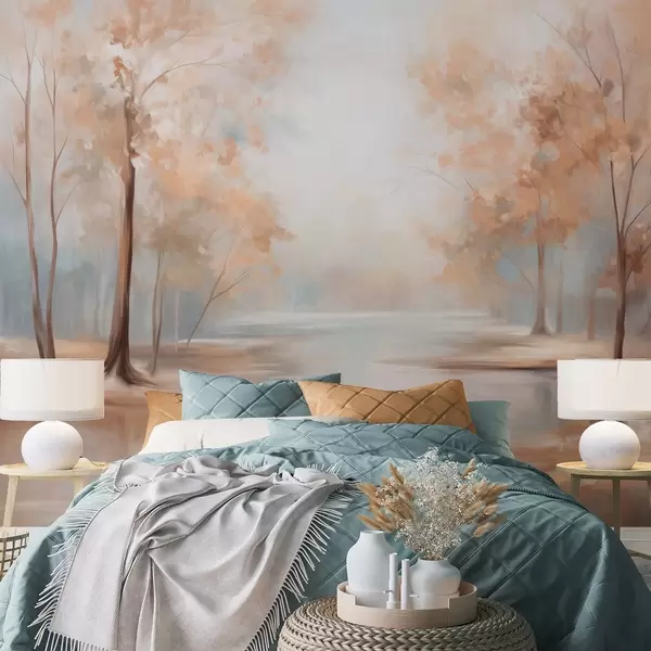 Fotobehang Herfstlandschap met bomen en een rivier, zachte kleuren, lichte en luchtige sfeer, vredig en rustig tafereel N° w09541