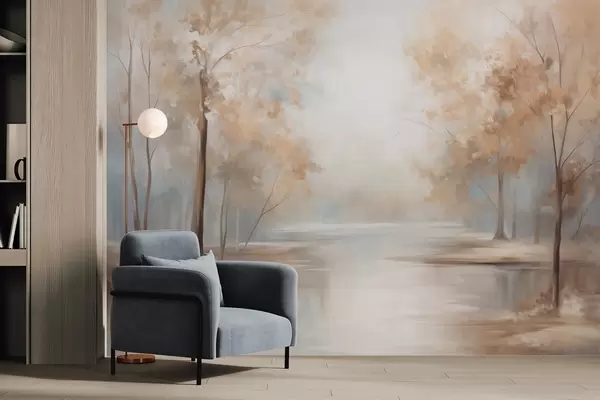 Fotobehang Herfstlandschap met bomen en een rivier, zachte kleuren, lichte en luchtige sfeer, vredig en rustig tafereel N° w09541