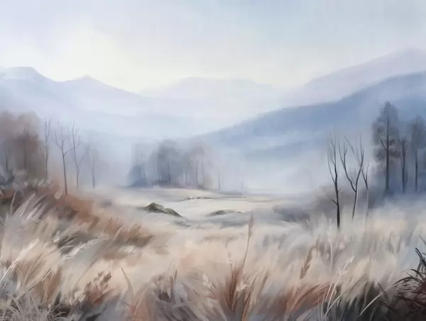 Fotobehang Getextureerd landschap met droog gras op de voorgrond en bomen op de achtergrond, met bergen in de verte N° w09542