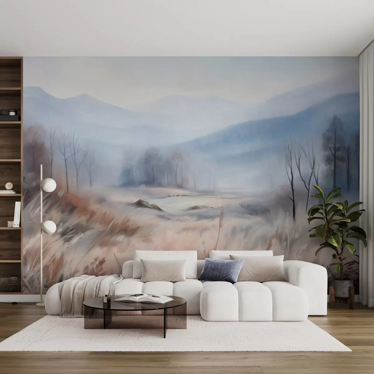 Fotobehang Getextureerd landschap met droog gras op de voorgrond en bomen op de achtergrond, met bergen in de verte N° w09542