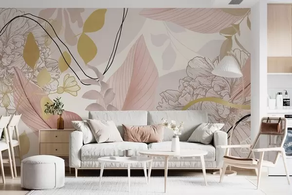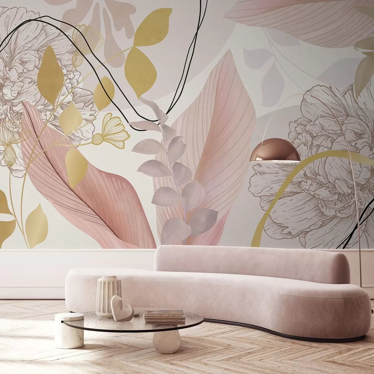 Fotobehang Abstracte bloemenprint met grote bladeren in gedempte roze en gele tinten met dunne zwarte lijnen en witte bloemcontouren. N° w09544v1