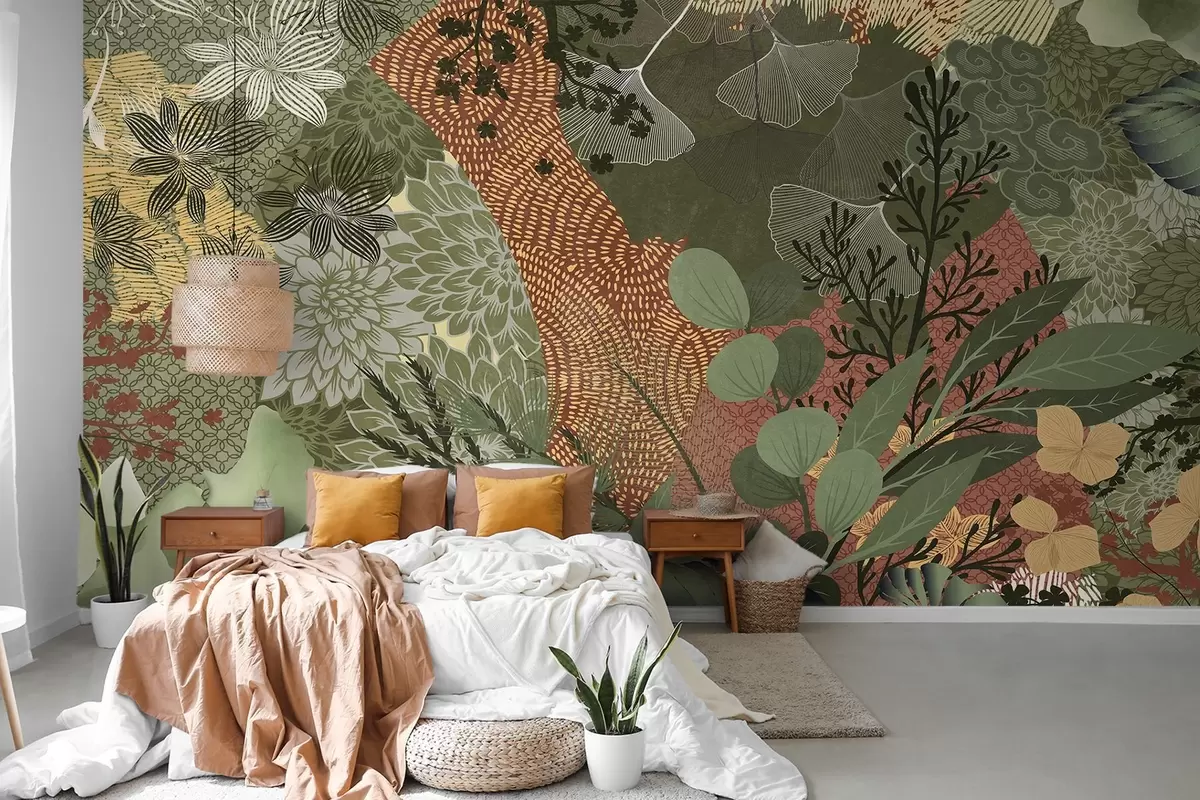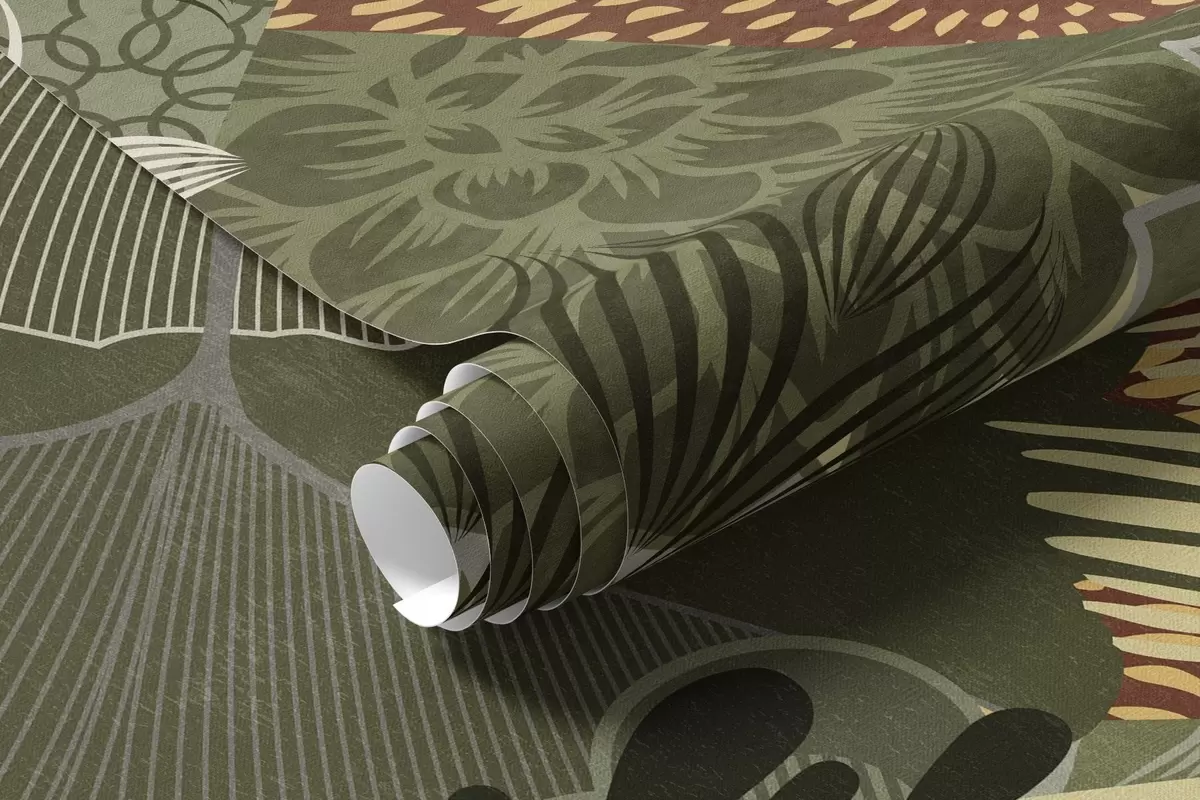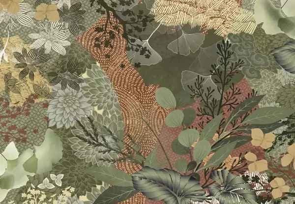 Fotobehang Abstracte collage met textuur van botanische elementen met bladeren, bloemen en organische texturen, in tinten groen en bruin. N° w09545