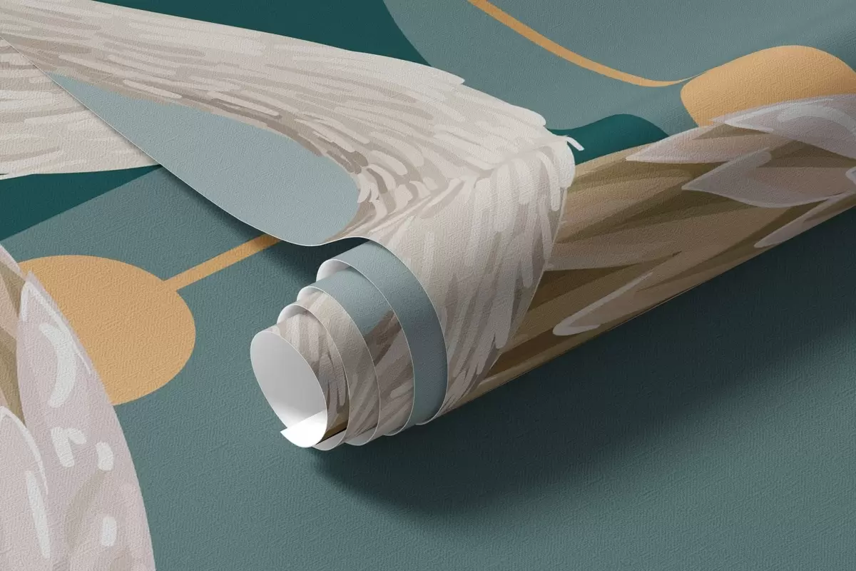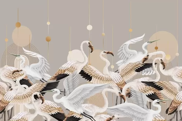 Fotobehang Een zwerm witte flamingo's met delicate vleugels, tegen een donkerblauwgroene achtergrond met gele lijnen en cirkels. N° w09546