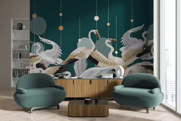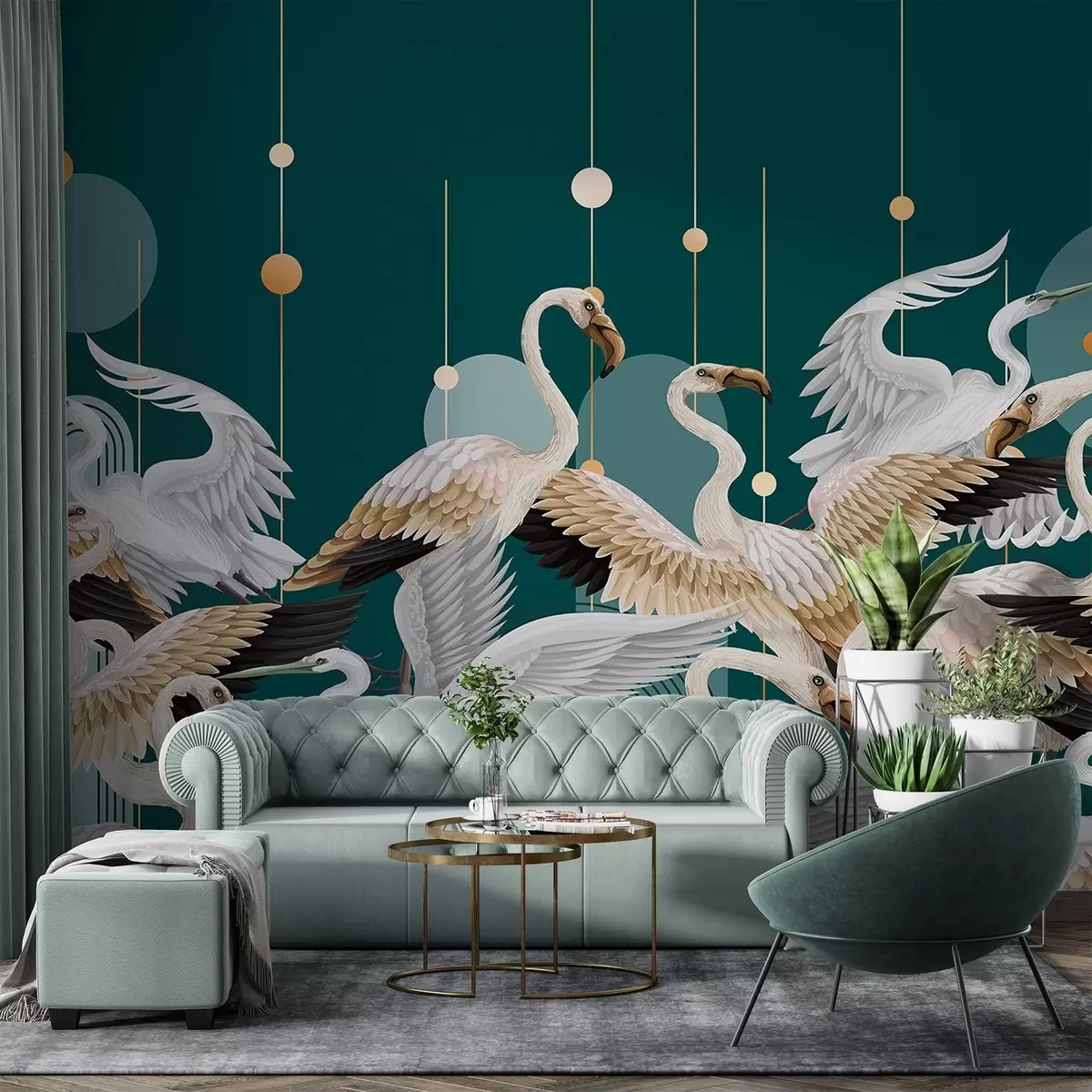 Fotobehang Een zwerm witte flamingo's met delicate vleugels, tegen een donkerblauwgroene achtergrond met gele lijnen en cirkels. N° w09546