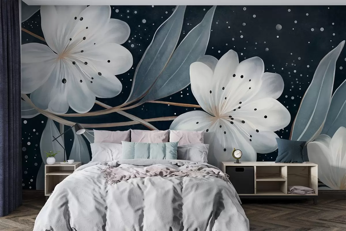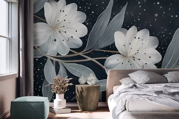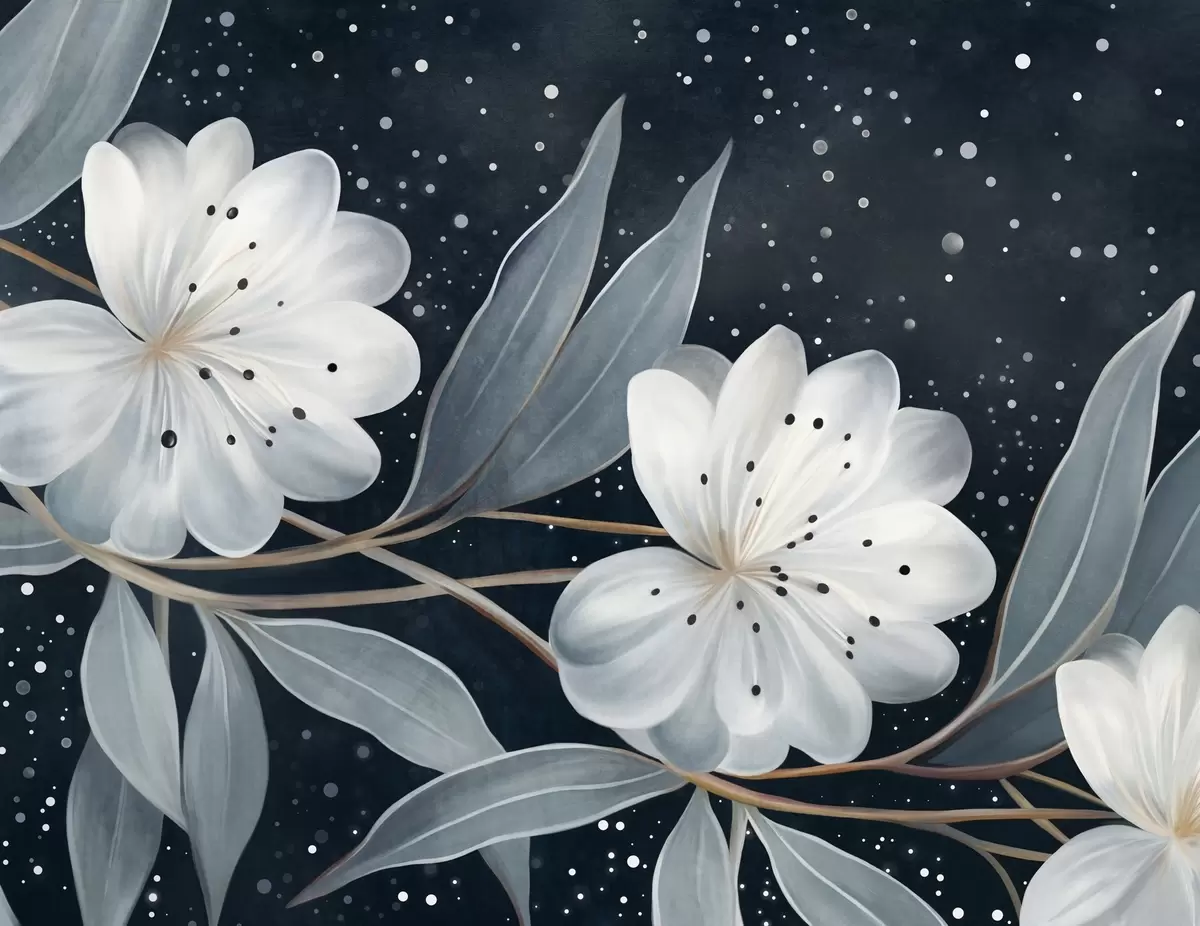 Fotobehang Fantasierijke witte bloemen met textuur, omgeven door blauwgroene bladeren en takken tegen een donkere achtergrond N° w09551
