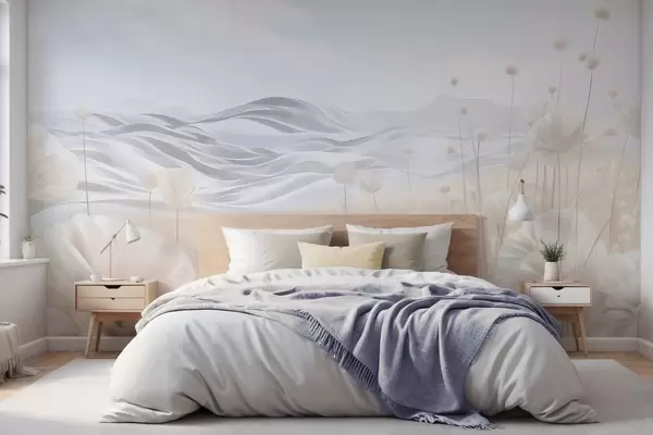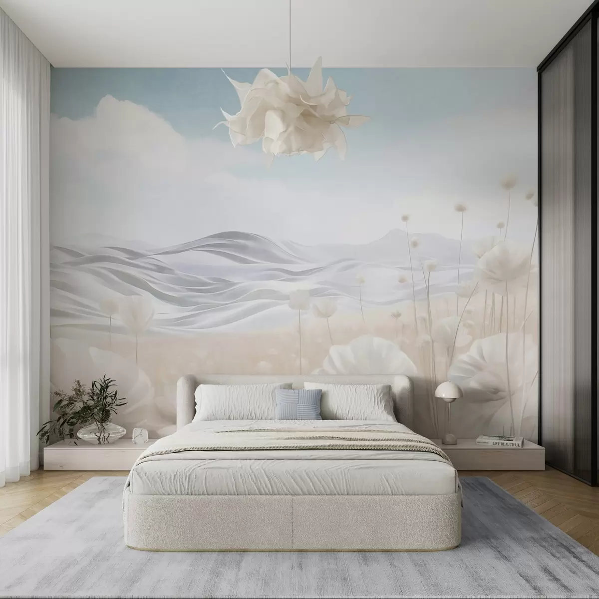 Fotobehang Getextureerd veld met crèmekleurige klaprozen en glooiende heuvels onder een lichtblauwe lucht met zachte wolken, pastelkleuren N° w09553