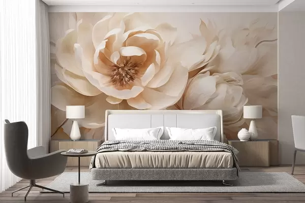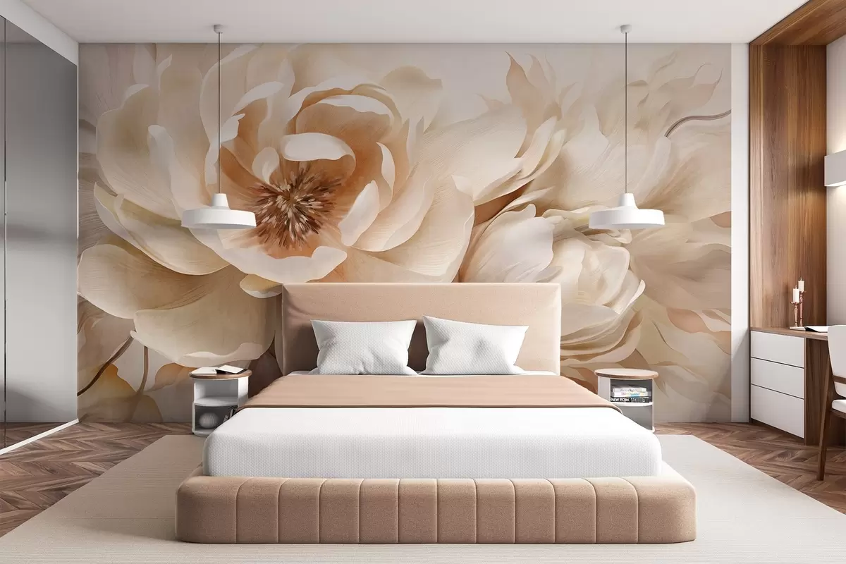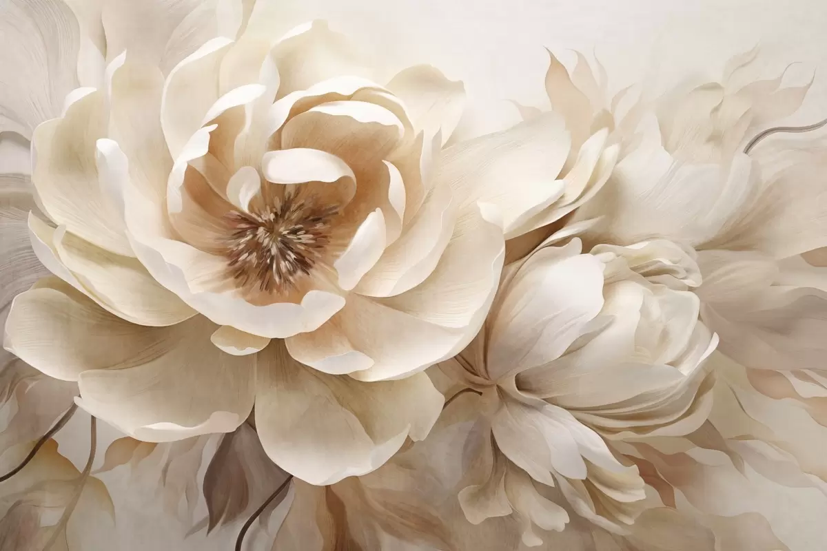 Fotobehang Romige pioenrozen met bruine hartjes en bladeren op een wazige, lichte abstracte achtergrond N° w09554