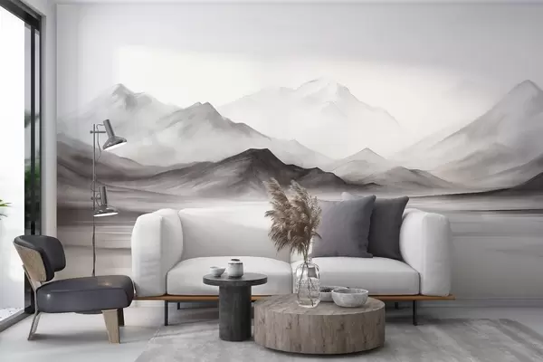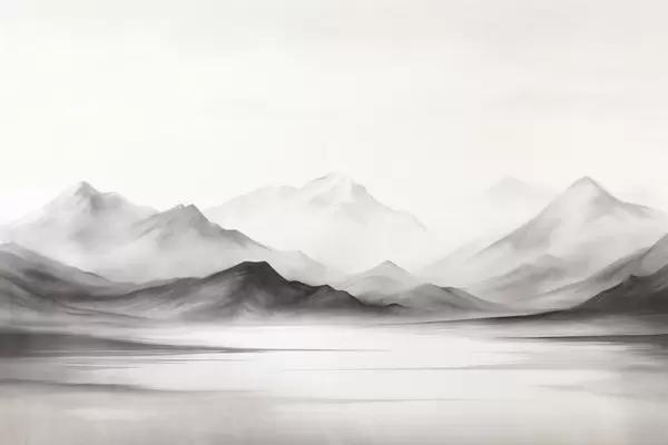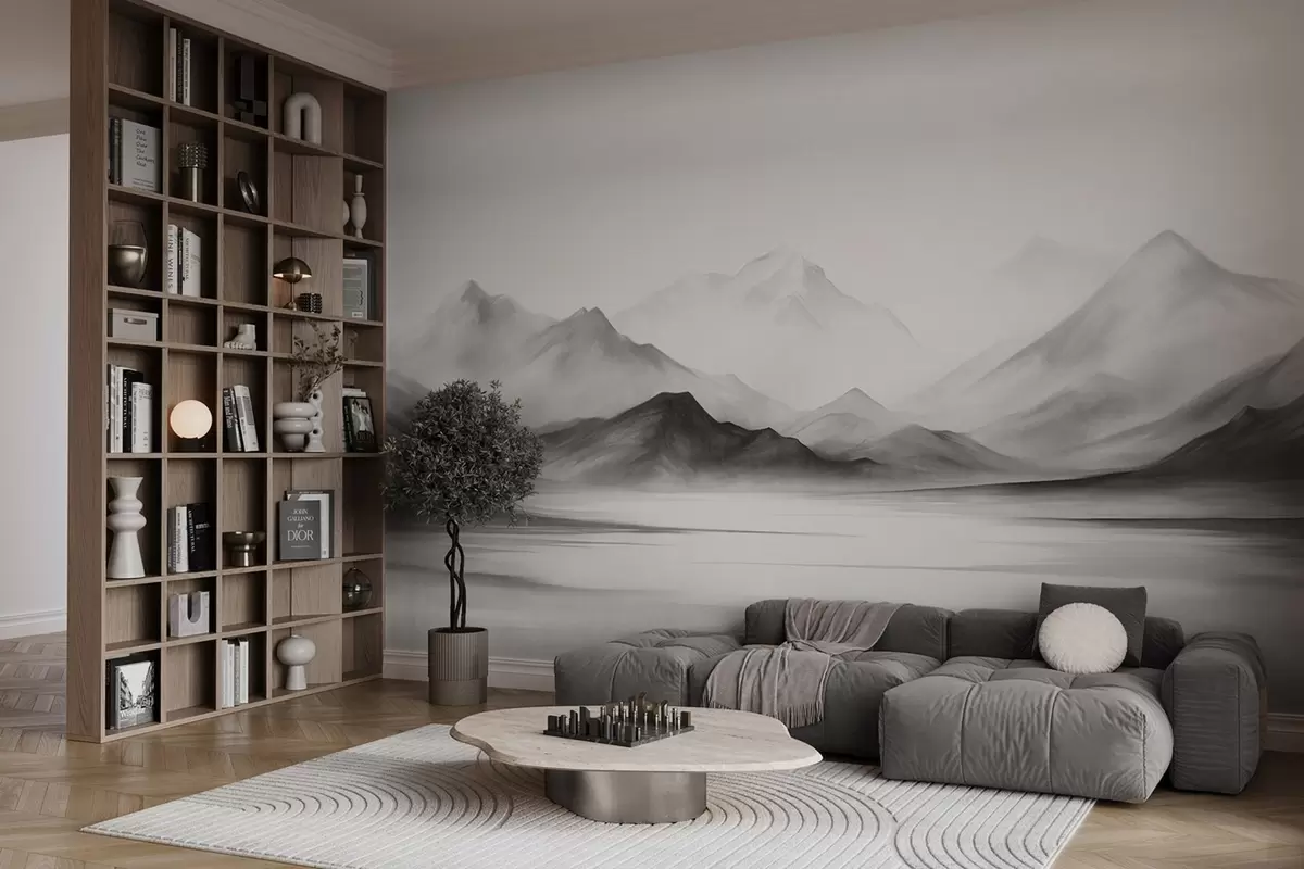 Fotobehang Een monochroom landschap met textuur, mistige bergen en een meer op de voorgrond. N° w09555