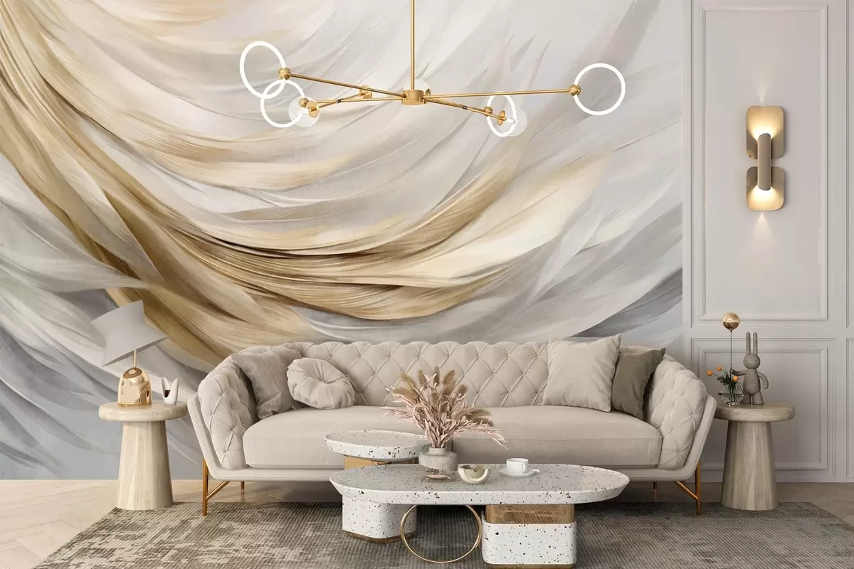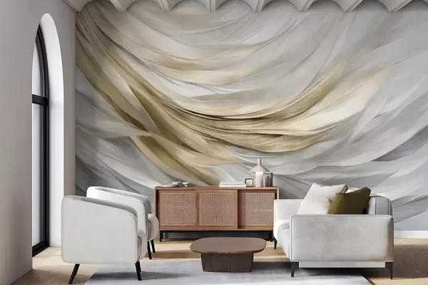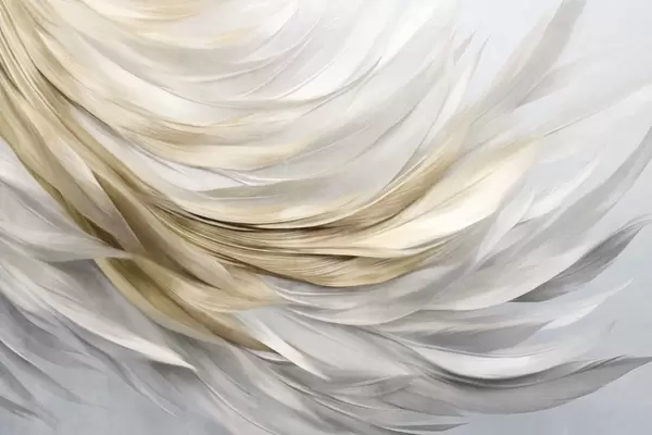 Fotobehang Abstracte getextureerde witte, grijze en gele veren, die een vloeiend, gelaagd patroon vormen tegen een lichte achtergrond. N° w09557
