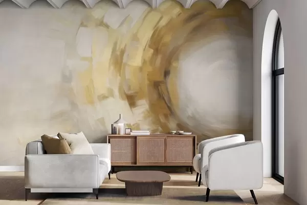 Fotobehang Abstracte schilderijimitatie met cirkelvormige, gestructureerde penseelstreken in geel en wit, die een gevoel van beweging creëren. N° w09558