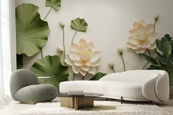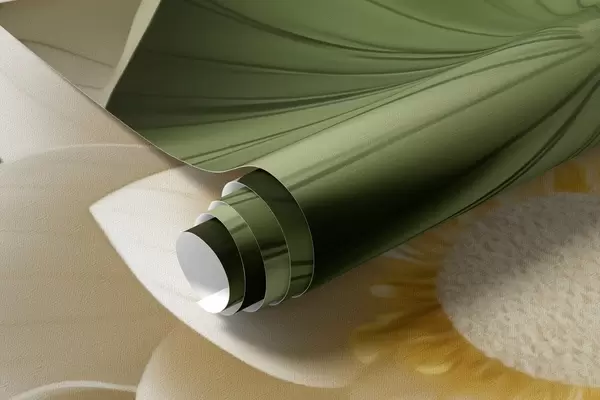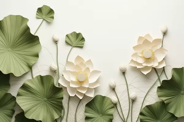 Fotobehang 3D-lotusbloemen met groene bladeren met textuur, minimalistische stijl N° w09560