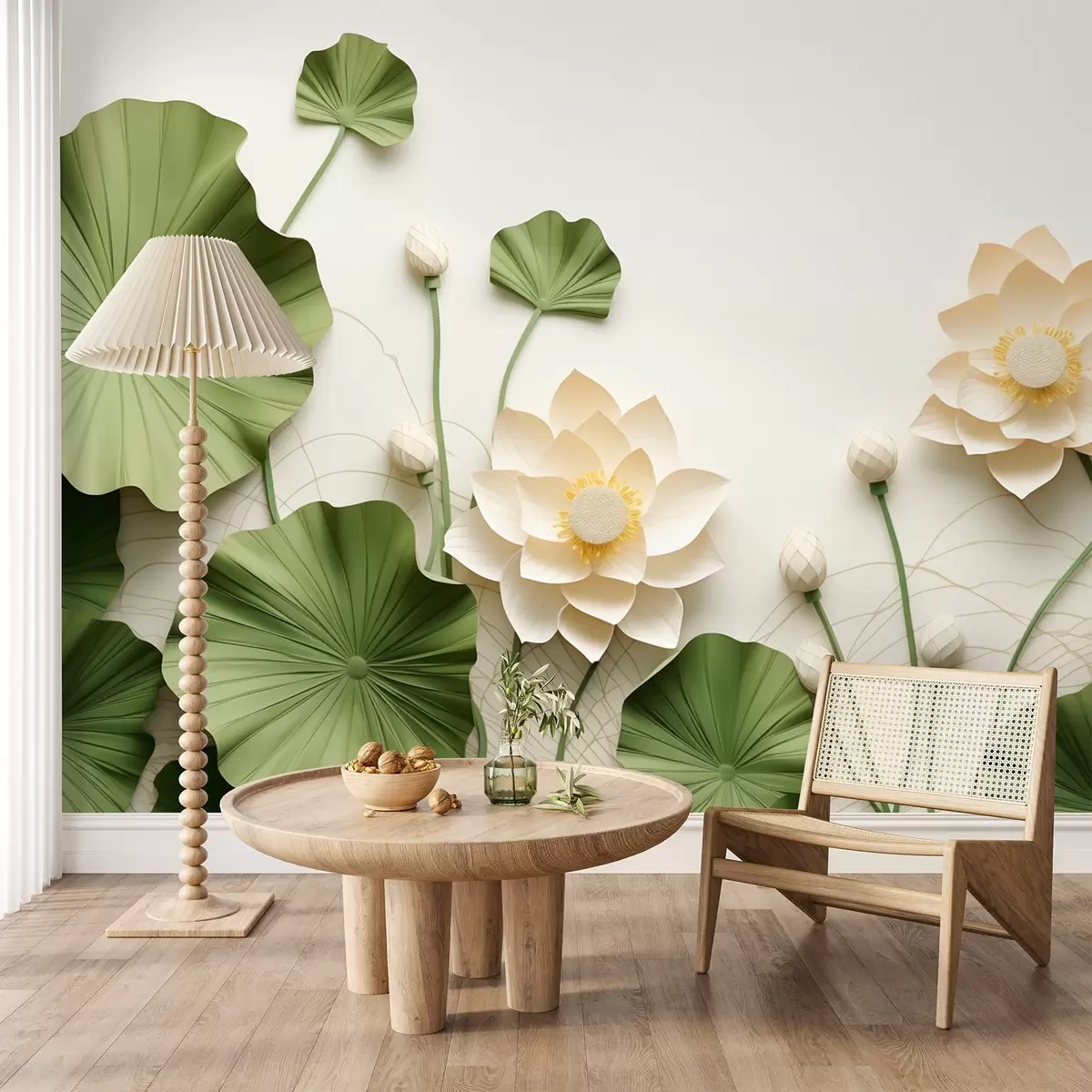 Fotobehang 3D-lotusbloemen met groene bladeren met textuur, minimalistische stijl N° w09560