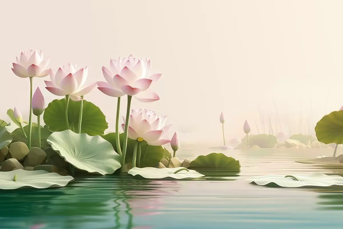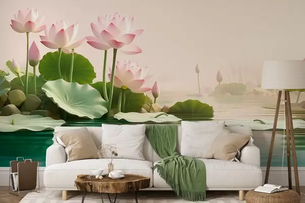 Fotobehang Roze lotusbloemen op het water, een rustig tropisch landschap N° w09561