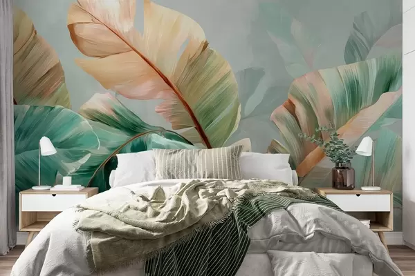 Fotobehang Delicate tropische bananenbladeren in pastelkleurige geelgroene tinten N° w09581