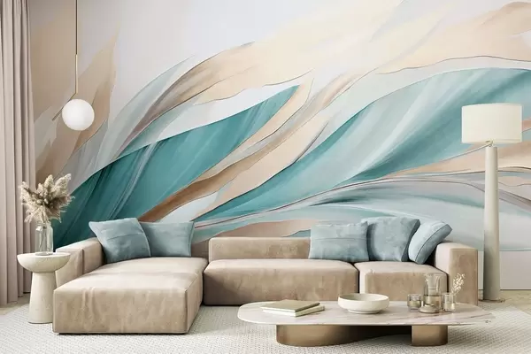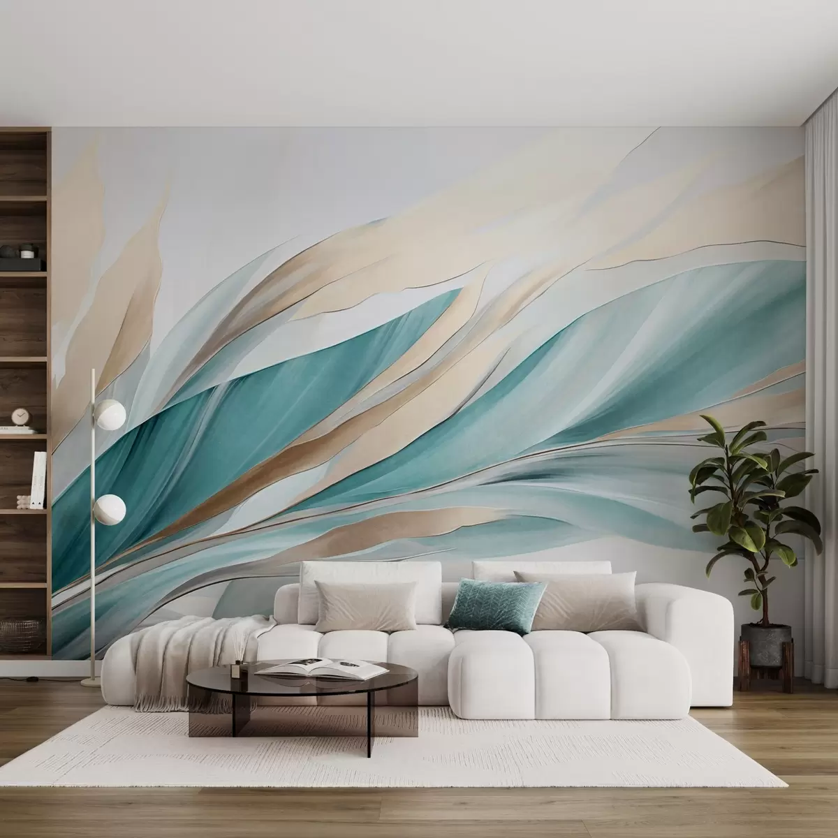 Fotobehang Abstracte golvende golven van blauwgroen en geel, met dunne vormen en lijnen, tegen een witte achtergrond, kunst met textuur N° w09585