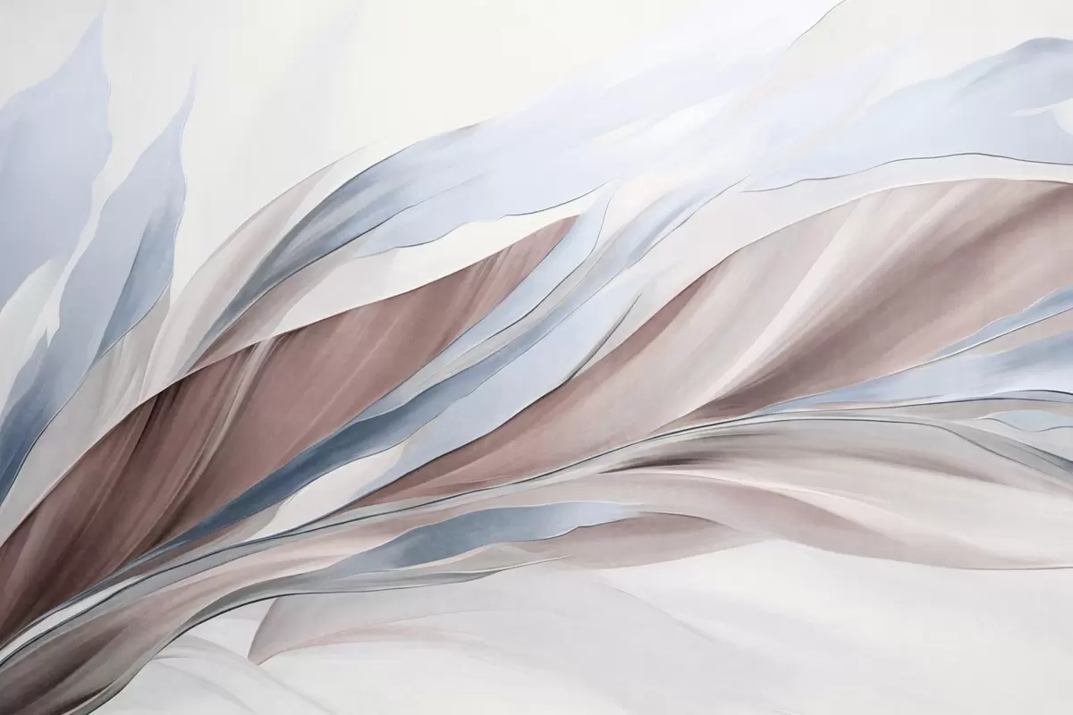 Fotobehang Abstracte golvende golven van blauw en bruin, met dunne vormen en lijnen, tegen een witte achtergrond, kunst met textuur N° w09585v1