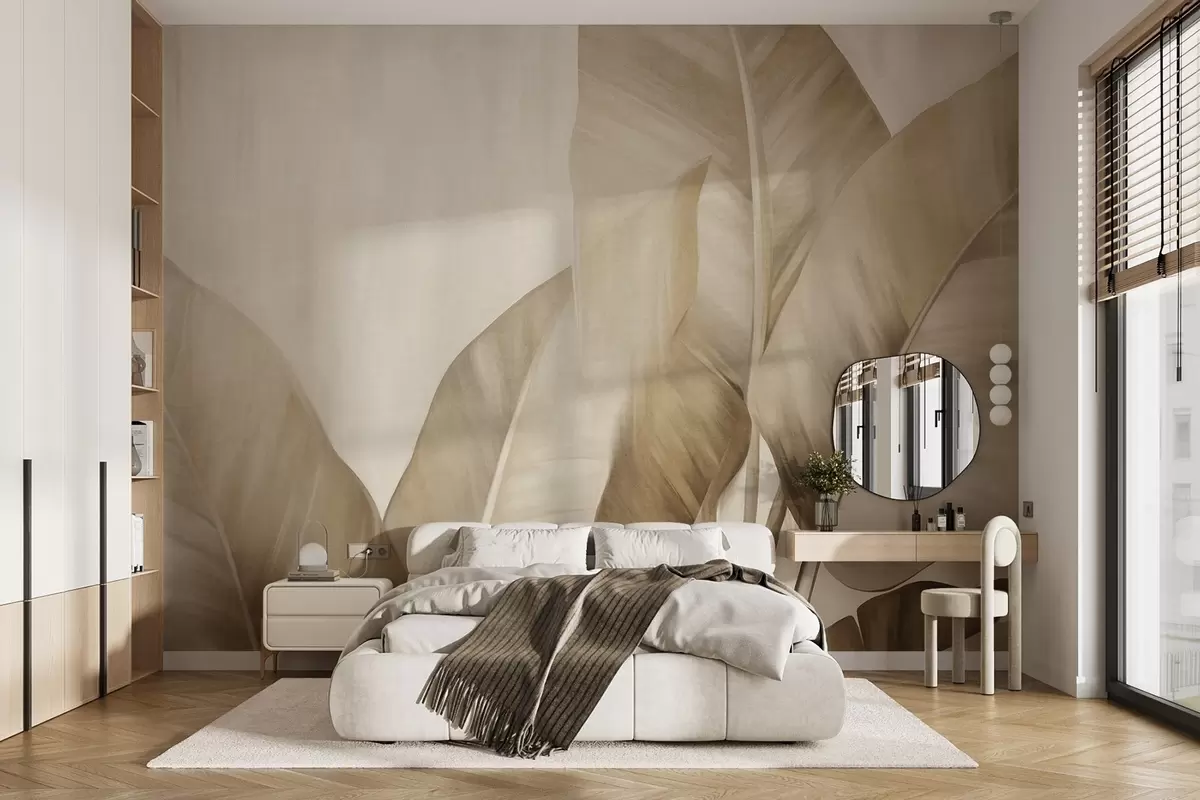 Fotobehang Getextureerde grote, lichtbruine bananenbladeren tegen een lichtbeige achtergrond, met een zachte en minimalistische esthetiek. N° w09586