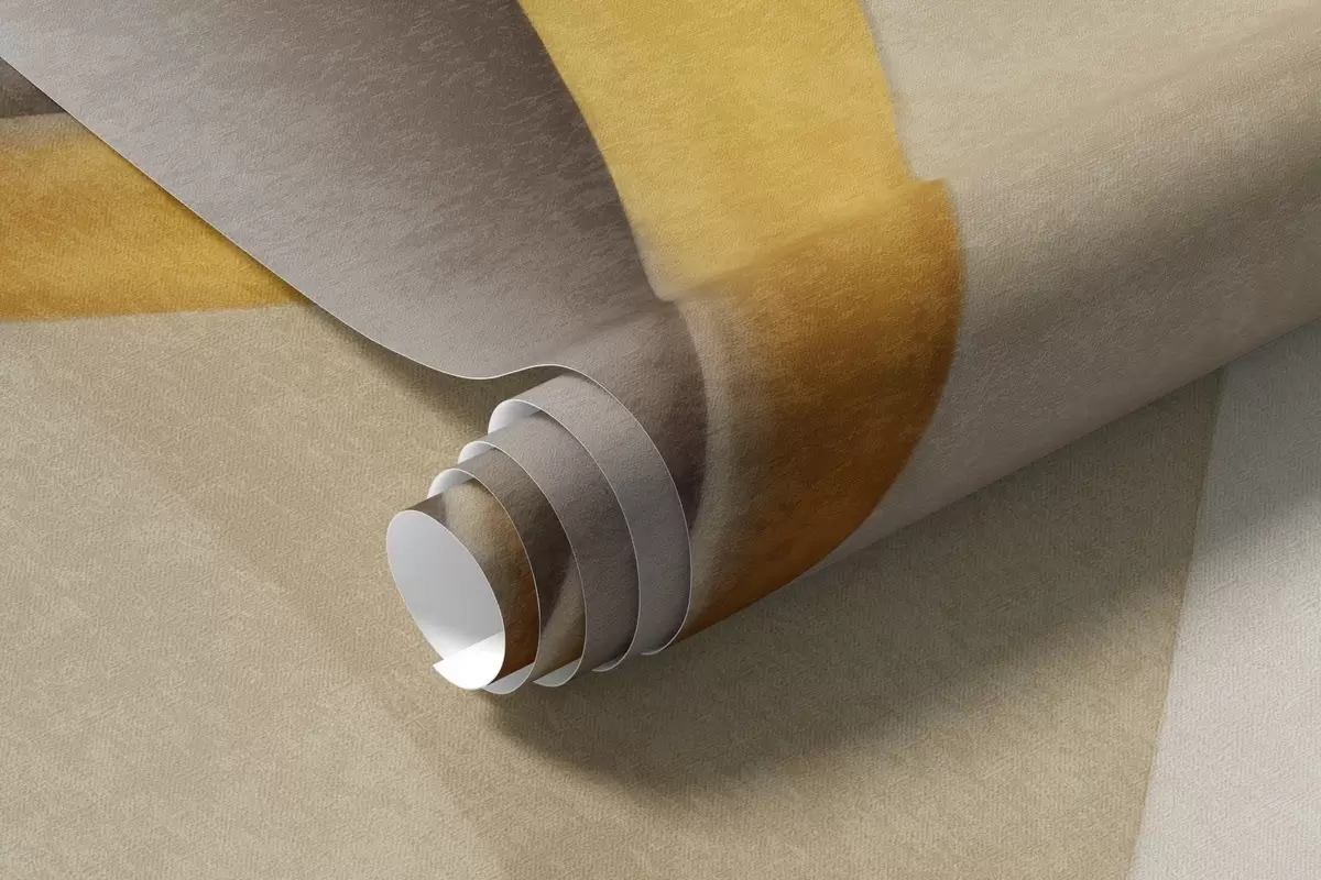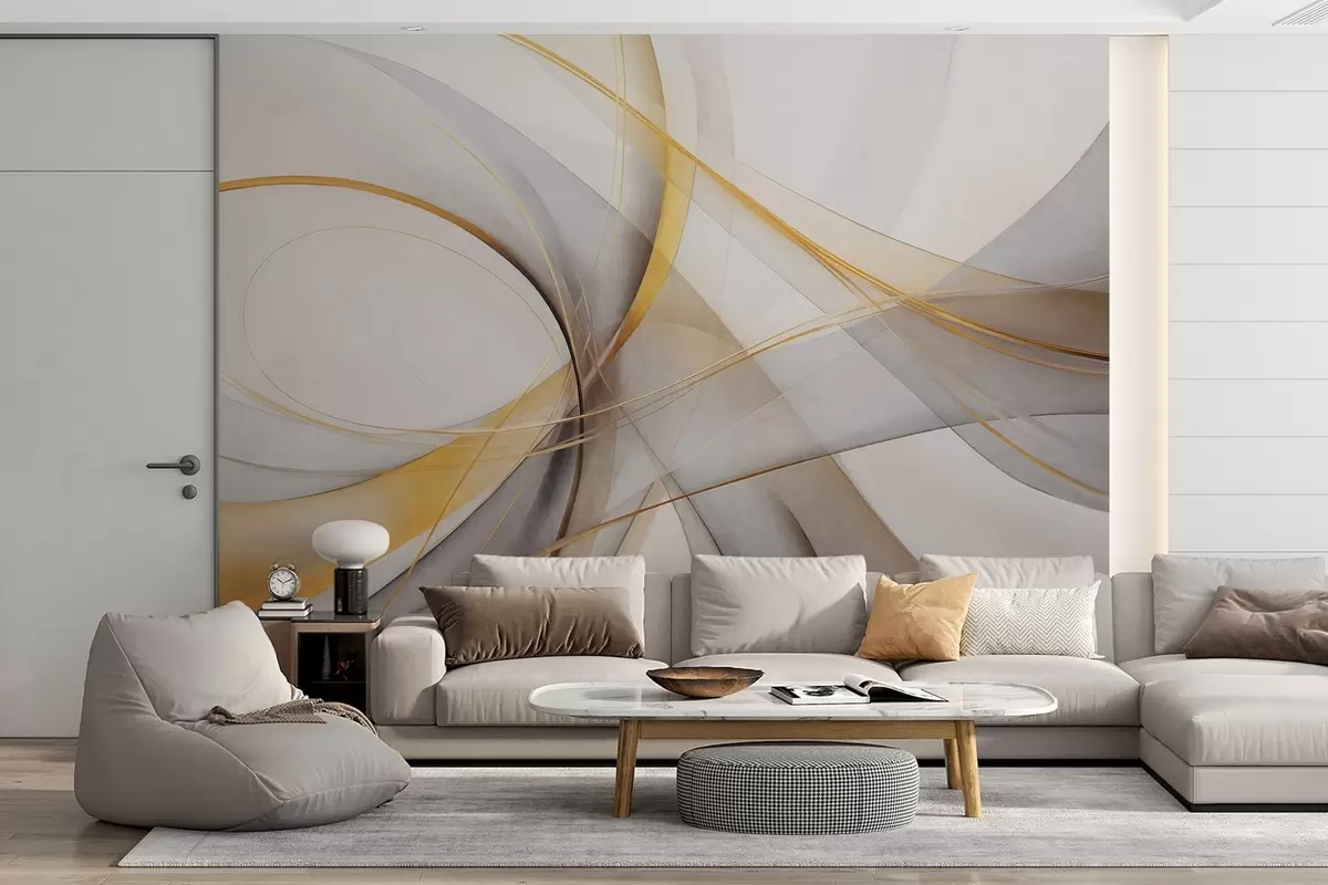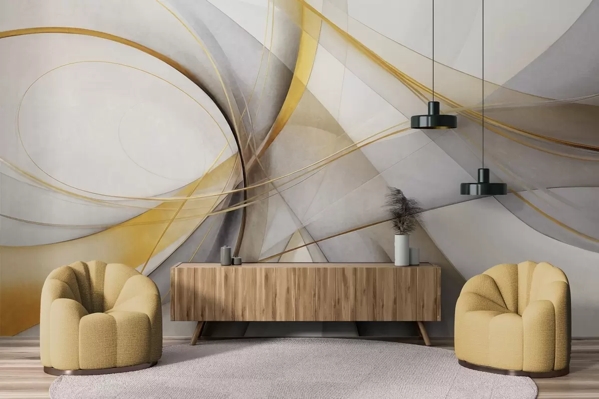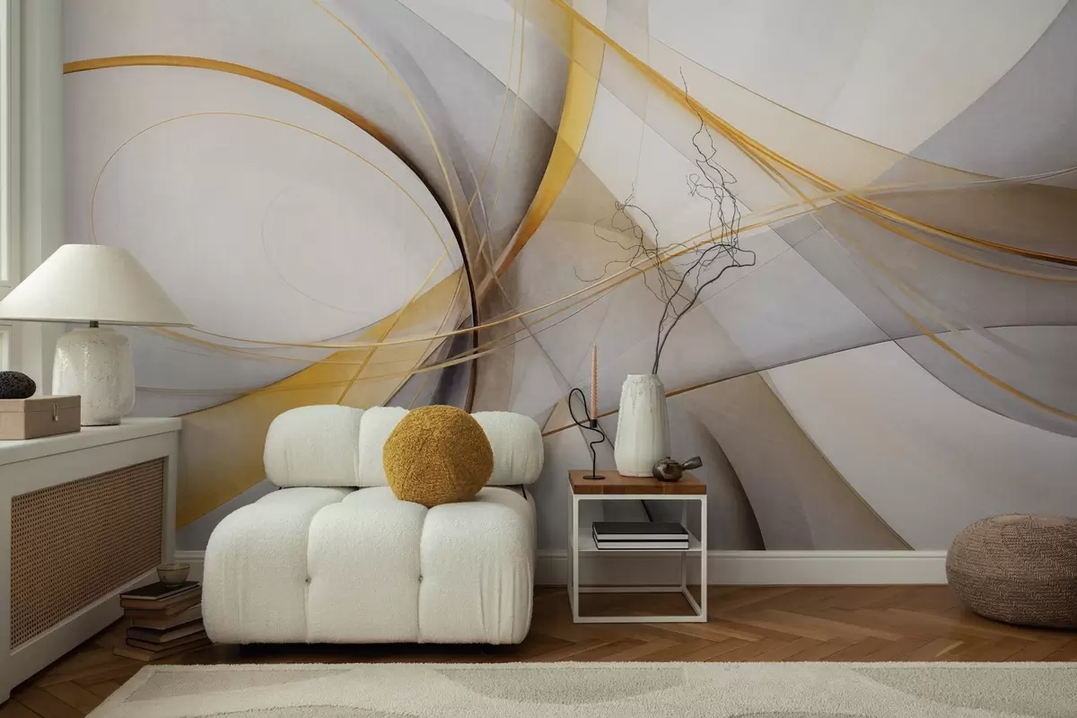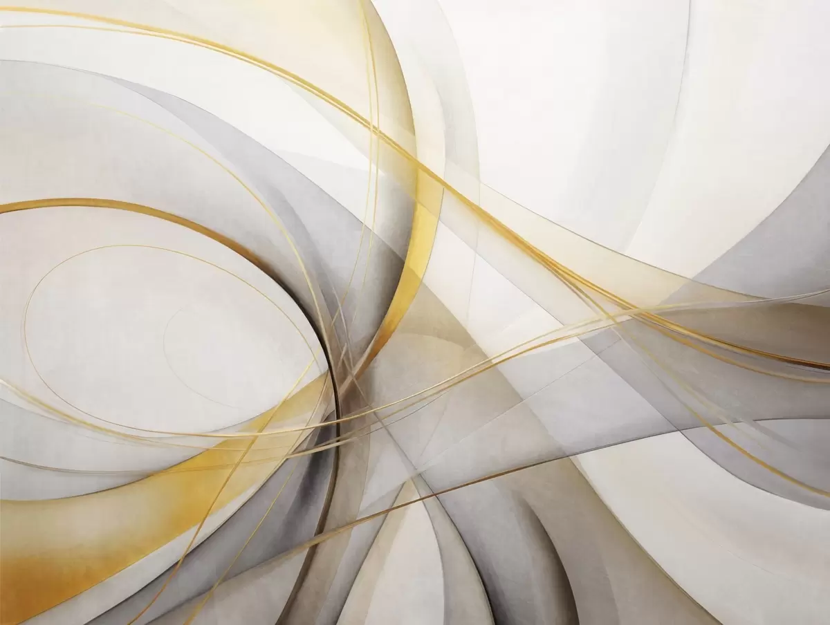 Fotobehang Abstracte vloeiende lijnen in geel en wit op een grijze achtergrond, met een gevoel van beweging en diepte, moderne kunst N° w09587