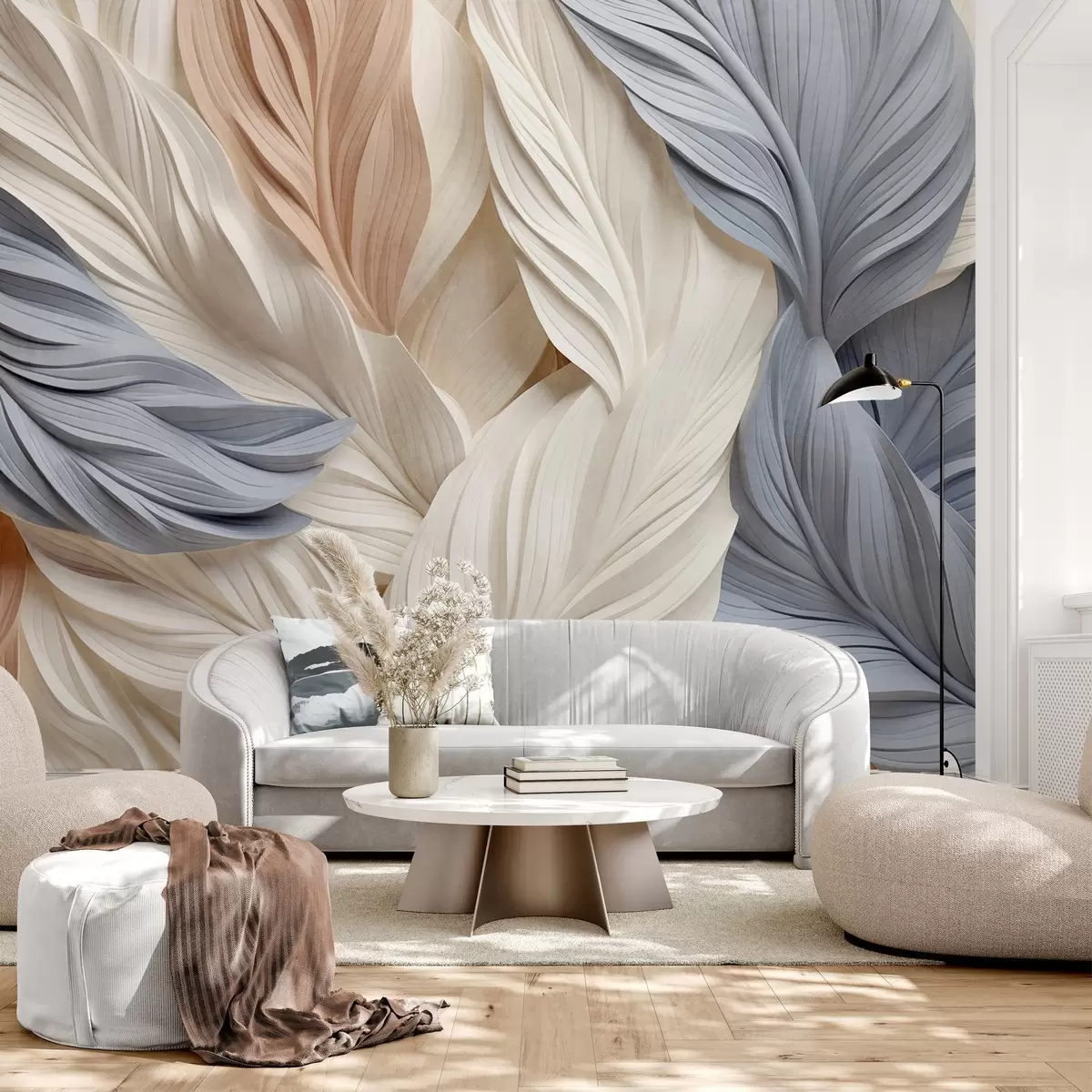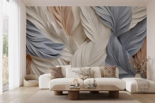 Fotobehang Abstracte, gelaagde veren in crèmekleurige, beige en lichtblauwe tinten, met een gestructureerd, organisch uiterlijk. N° w09603
