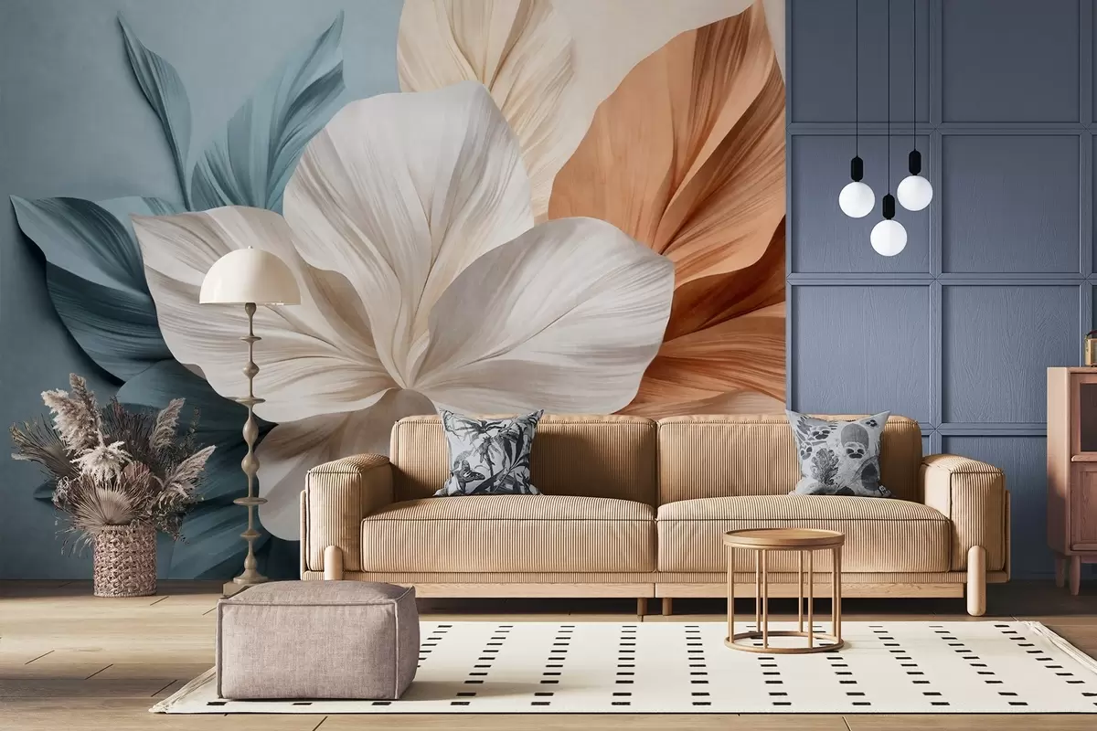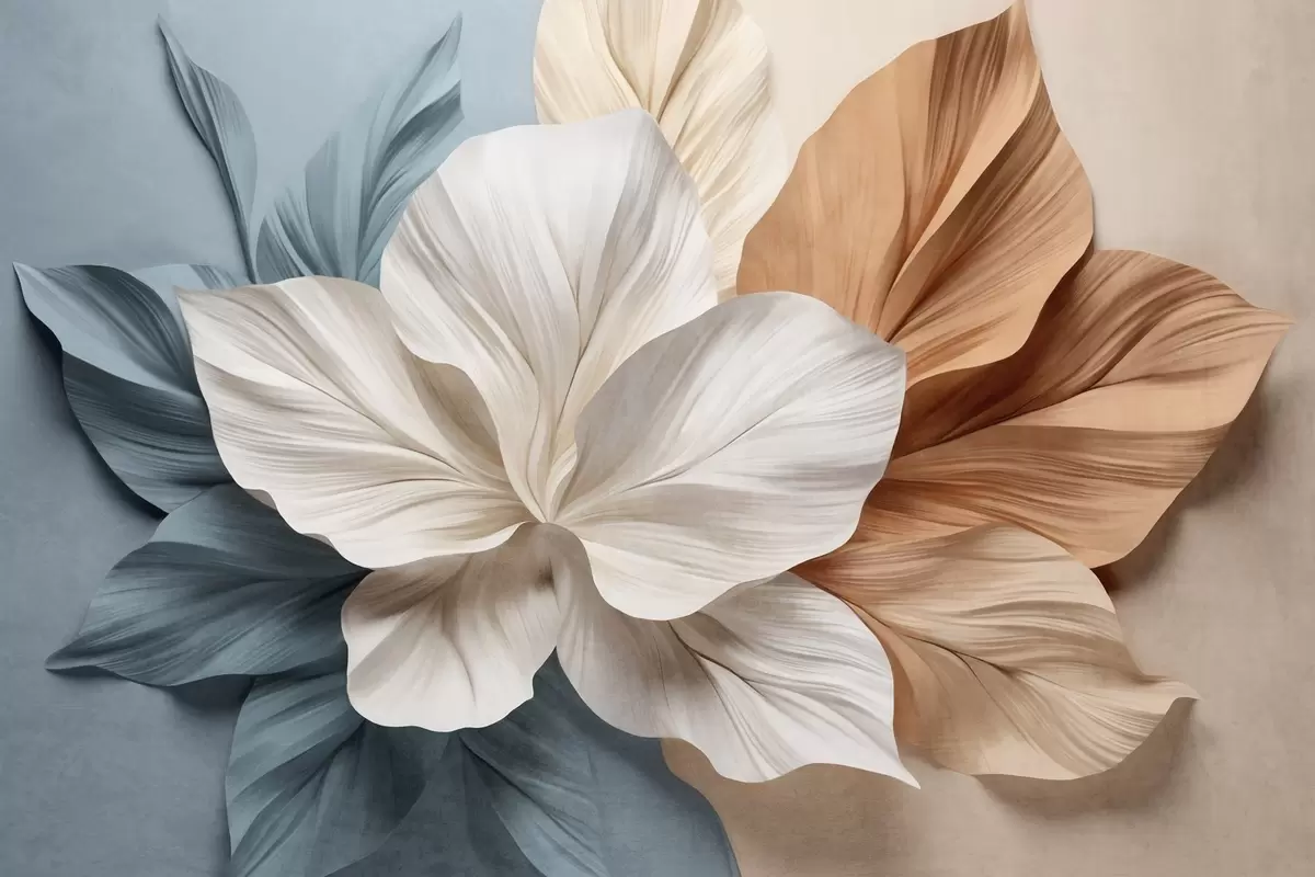 Fotobehang Abstracte bloem met meerdere bloemblaadjes en gestructureerde bladeren in perzikkleurige en blauwe tinten, zachte achtergrond N° w09604