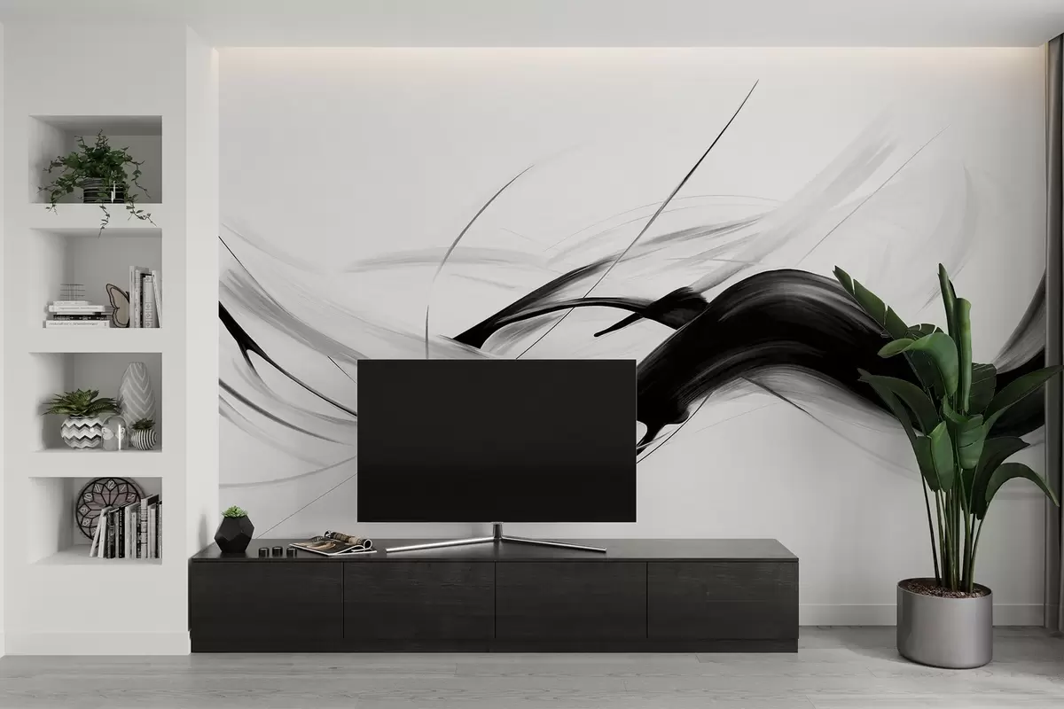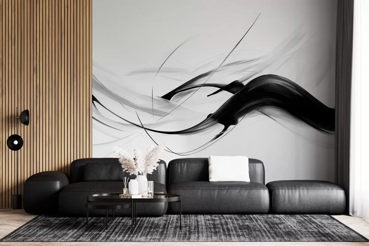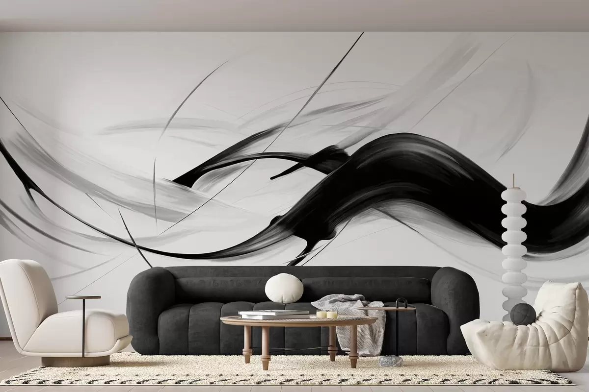 Fotobehang Abstracte zwart-witte penseelstreken met dunne lijnen die een modern ontwerp vormen tegen een lichte achtergrond. N° w09605