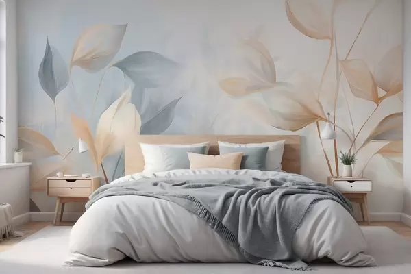 Fotobehang Zachte, delicate, doorschijnende bladeren in gedempte tinten beige, perzik en lichtblauw, gestructureerde pastelkunst N° w09607