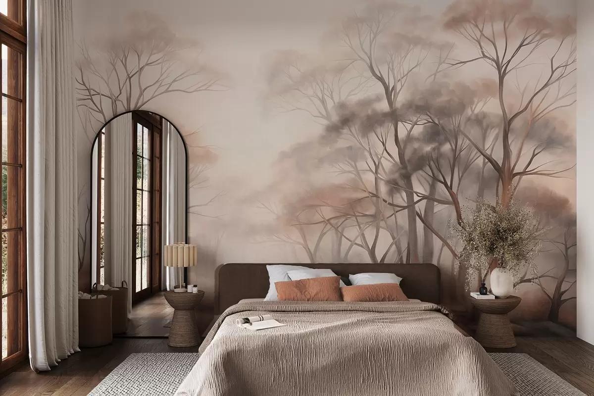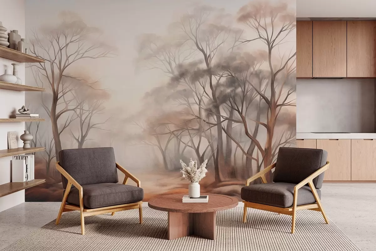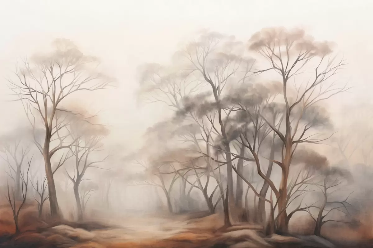 Fotobehang Getextureerde bomen in een nevelig bos, mistig landschap met ingetogen, gedempte kleuren en zachte belichting N° w09609