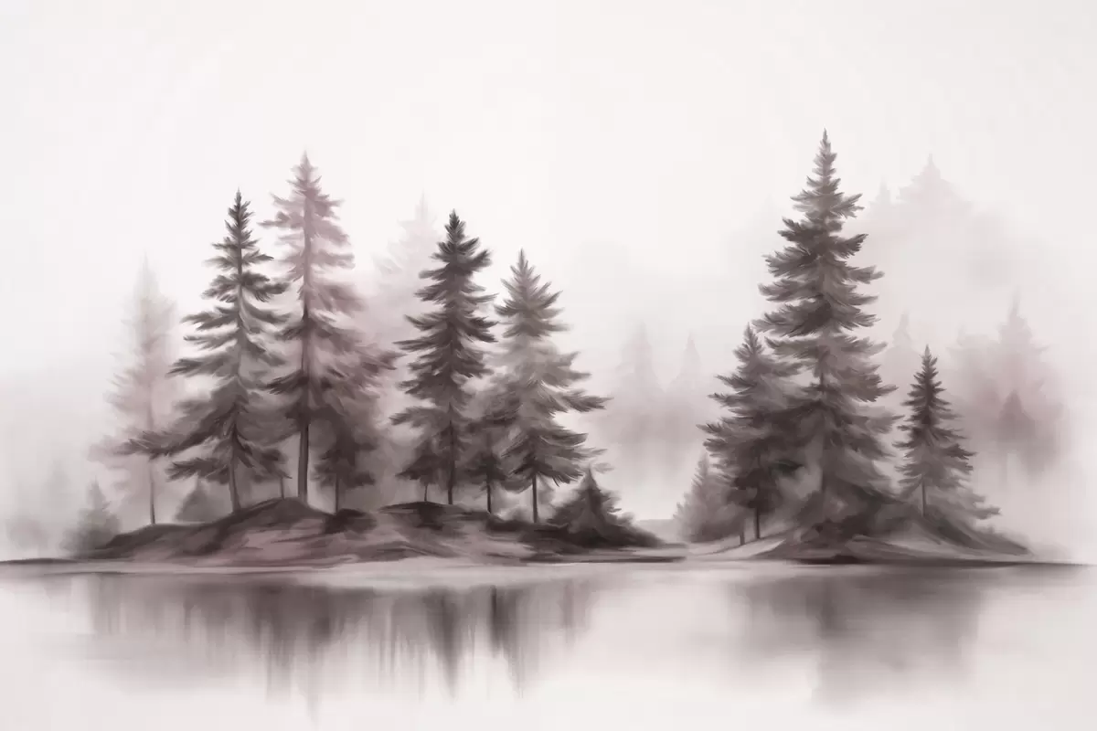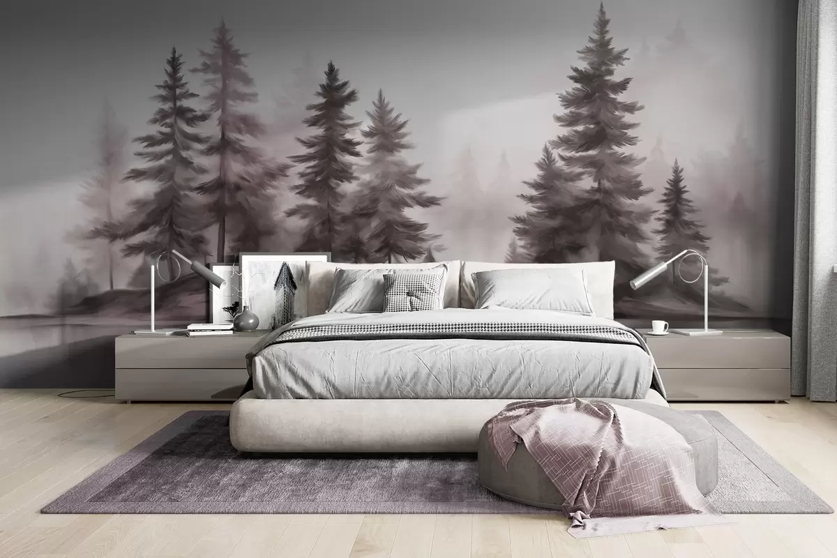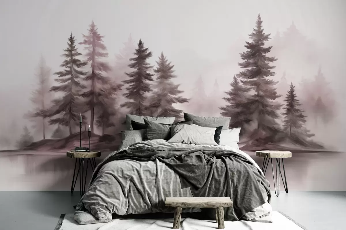 Fotobehang Een mistig bos met textuur en hoge dennenbomen, imitatie schilderij N° w09610v1