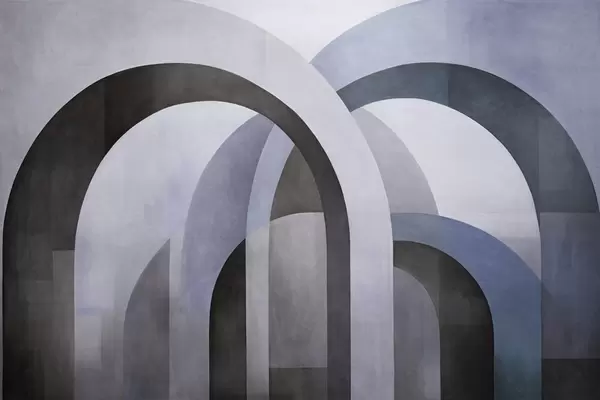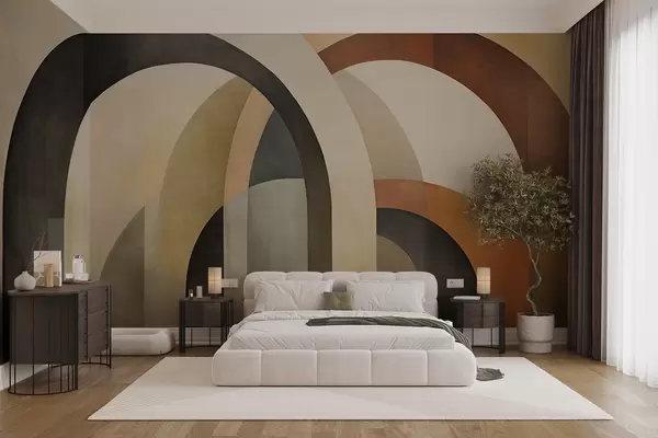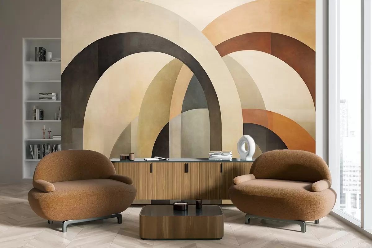 Fotobehang Abstracte geometrische bogen met textuur in aardetinten van beige, bruin en grijs, een gelaagd modern architectonisch ontwerp N° w09611