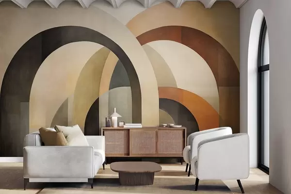 Fotobehang Abstracte geometrische bogen met textuur in aardetinten van beige, bruin en grijs, een gelaagd modern architectonisch ontwerp N° w09611