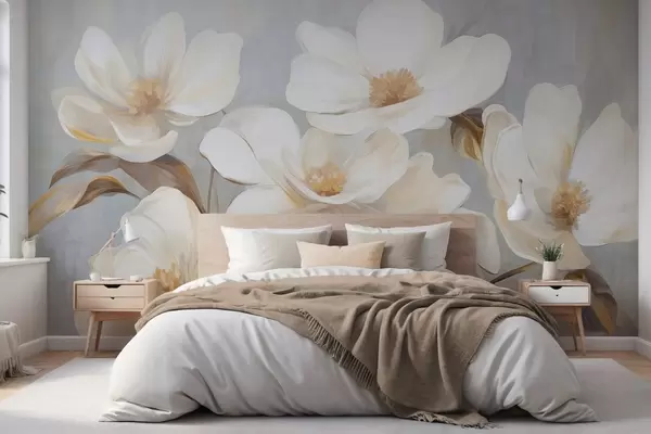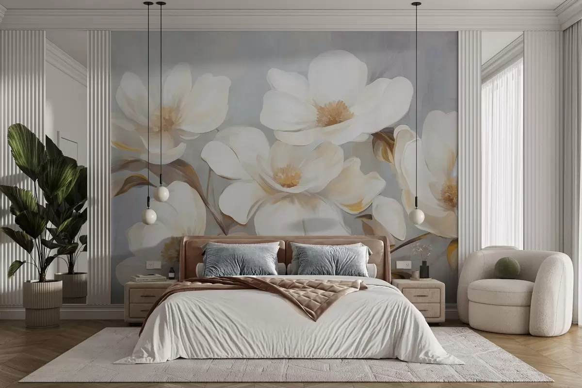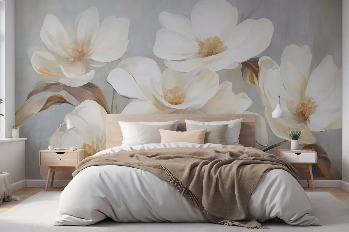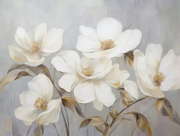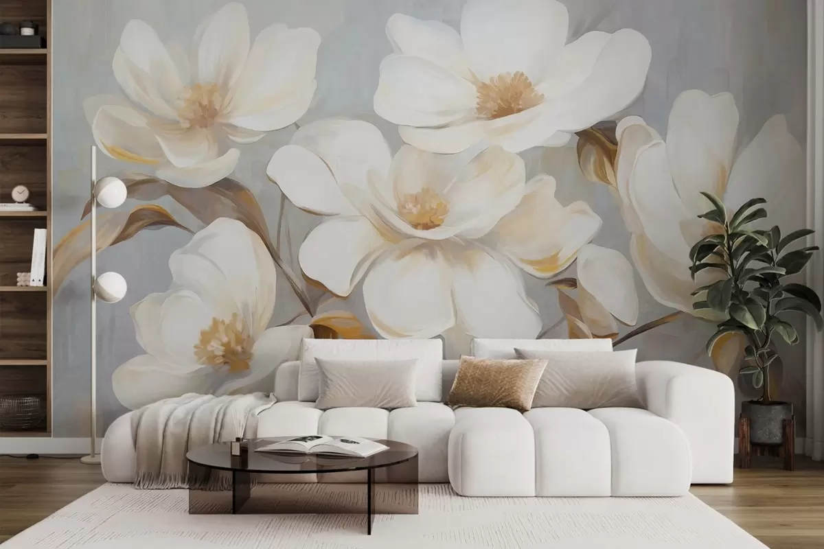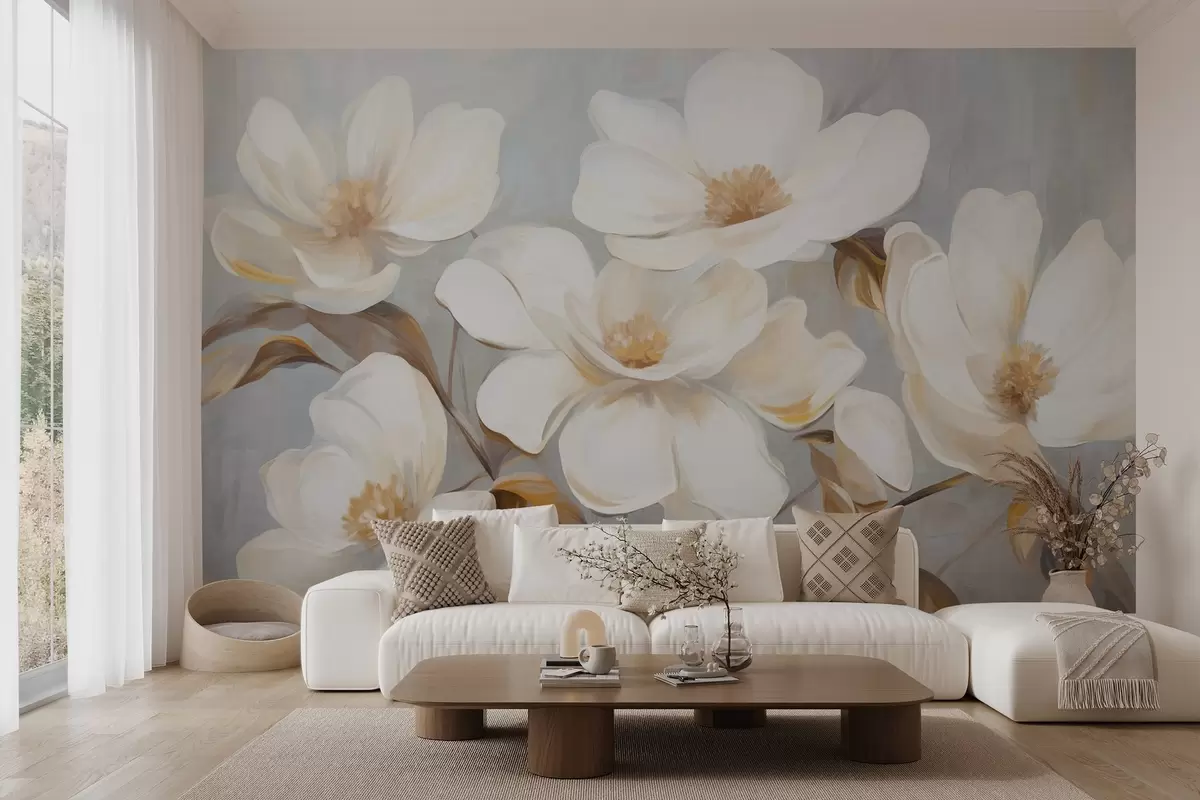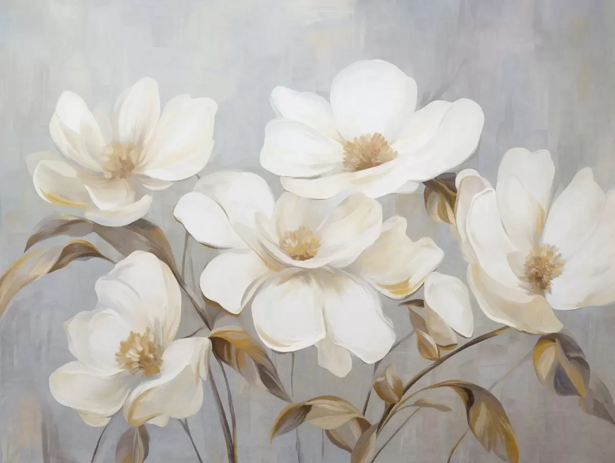 Fotobehang Een geschilderde imitatie met textuur van verschillende witte magnoliabloemen tegen een gedempte pastelkleurige achtergrond. N° w09612